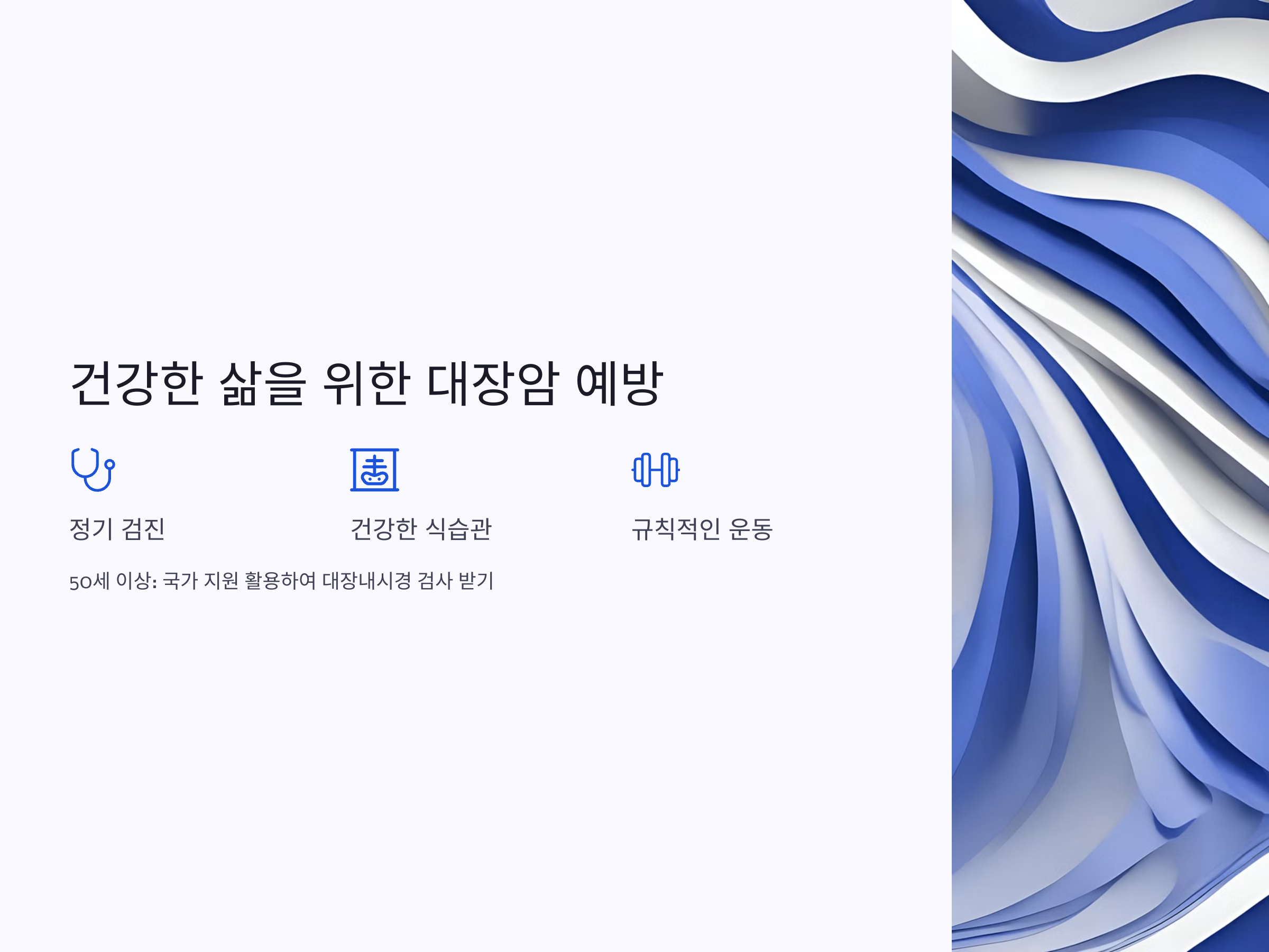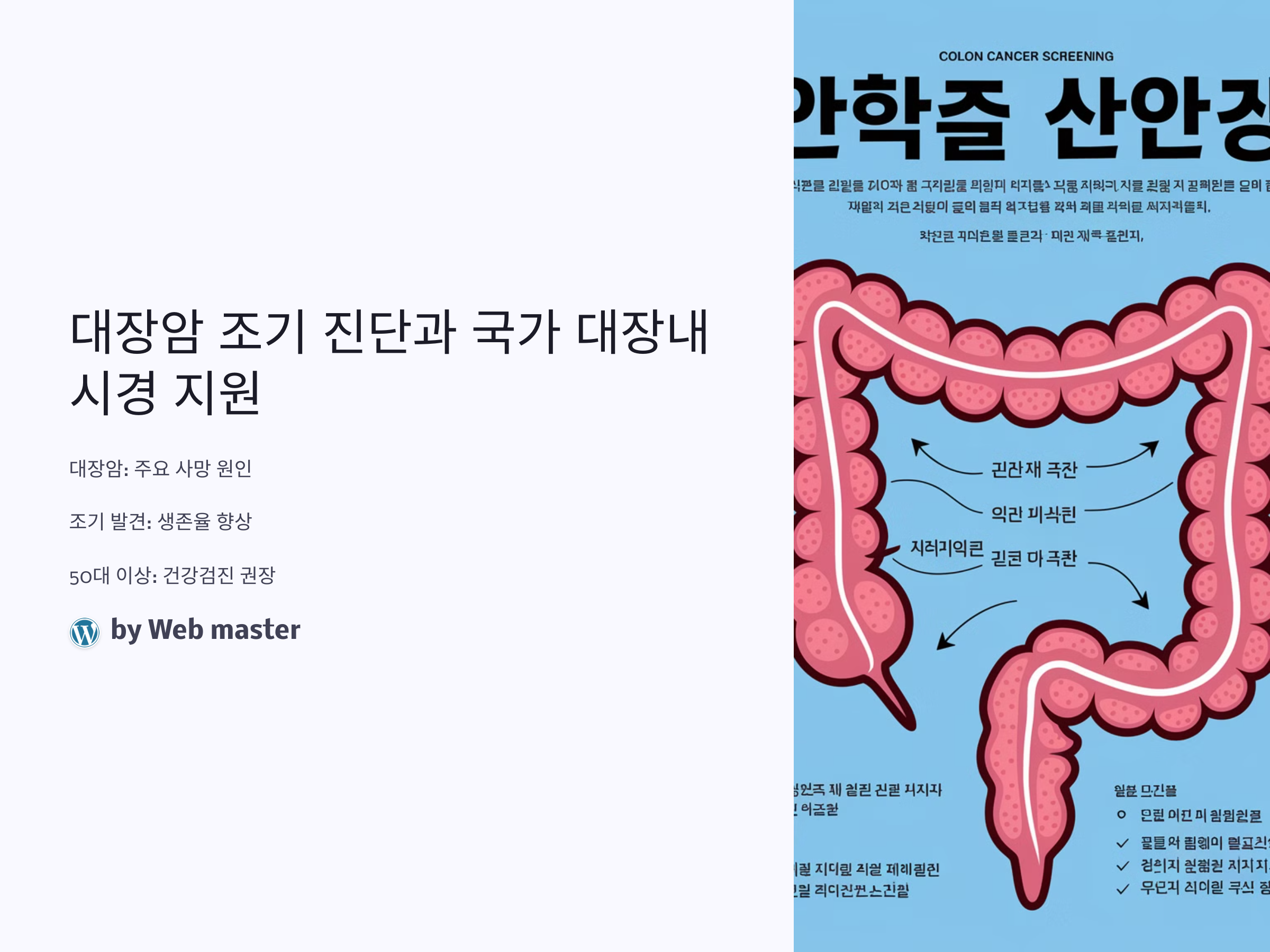 대장암은 조기에 발견할수록 생존율이 높아지는 질병입니다. 대장내시경을 통해 정기적인 건강검진을 받고, 대장암 예방에 힘써야 합니다. 국가에서 제공하는 대장내시경 지원을 적극적으로 활용하여 건강을 지키세요.
