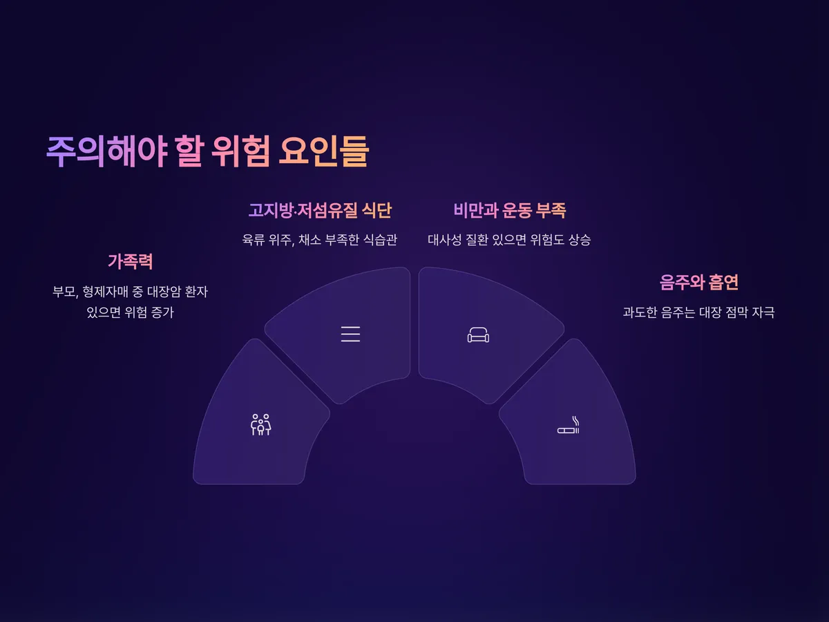 대장암의 발생에는 다양한 요인이 작용합니다. 특히 유전적 요인과 환경적 요인이 복합적으로 영향을 미치며, 아래와 같은 위험 요인을 가지고 있다면 각별한 주의가 필요합니다.