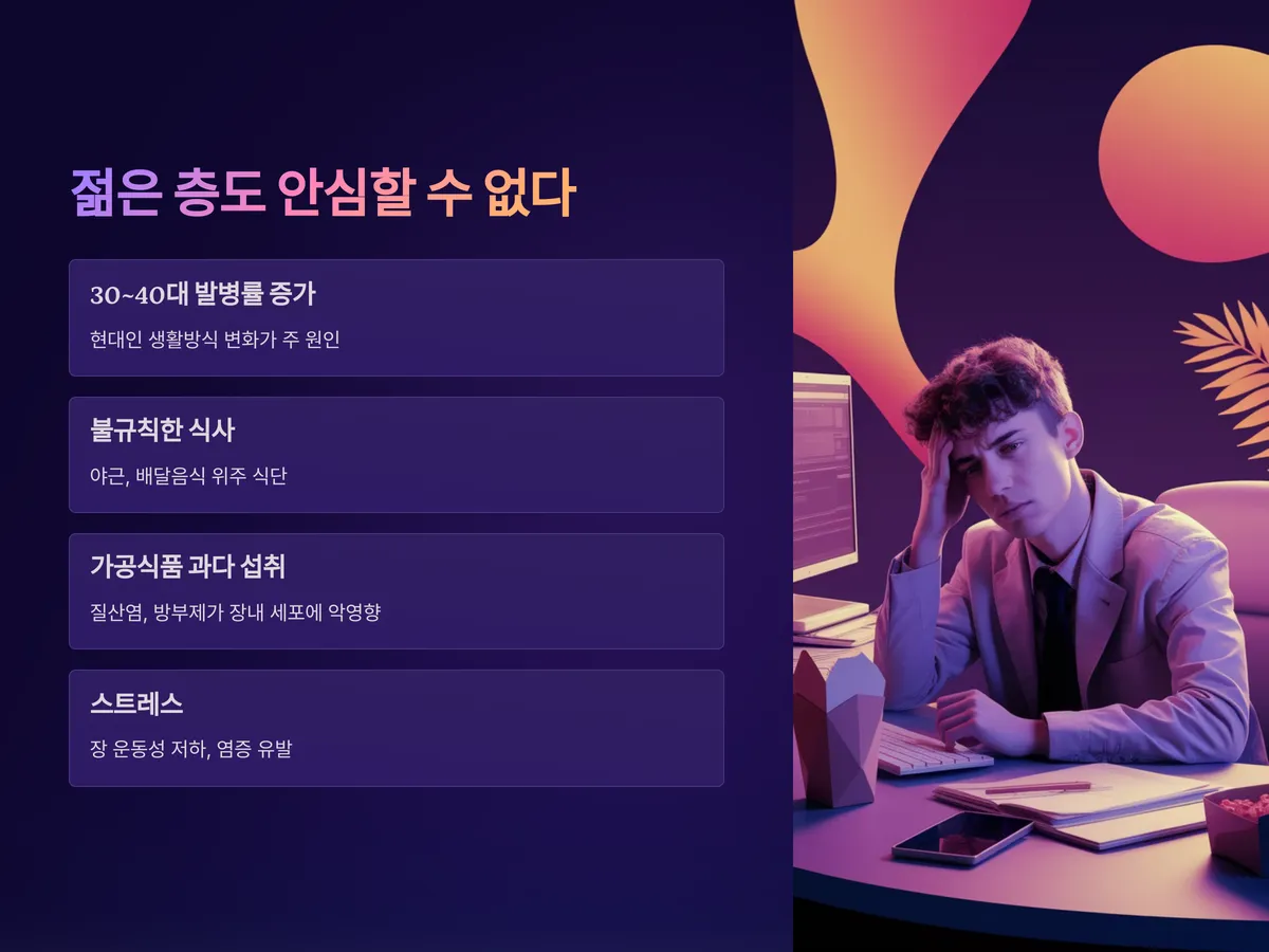 최근 30~40대에서도 대장암 발병률이 꾸준히 증가하고 있습니다. 이는 불규칙한 식사, 배달음식 위주의 식단, 스트레스, 수면 부족 등 현대인의 생활 방식 변화가 주된 원인으로 분석됩니다.