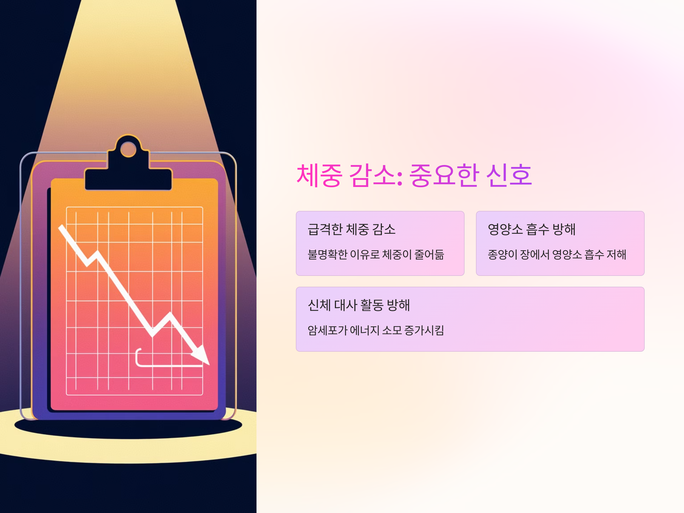 체중 감소는 대장암 초기 증상 중 하나로, 종종 놓치기 쉬운 중요한 신호입니다. 대장암에 걸린 환자들은 종종 불명확한 이유로 체중이 급격히 감소하는 경우가 많습니다. 체중 감소는 대개 식욕 부진이나 영양 부족에서 비롯되지만, 실제로는 암세포가 신체에서 대사 활동을 방해하거나, 장에 있는 종양이 영양소를 제대로 흡수하지 못하게 만드는 경우도 있습니다.