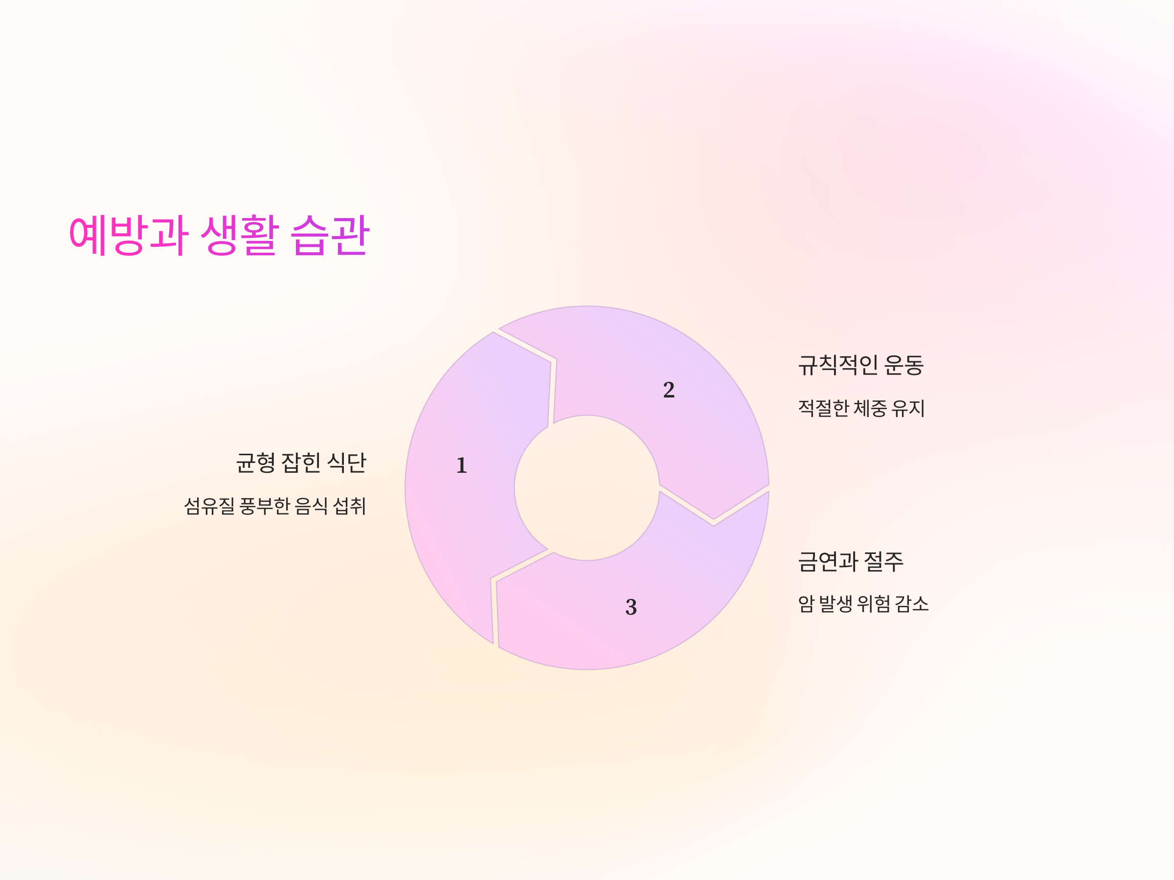 또한, 규칙적인 운동을 통해 체중을 적절히 관리하고, 술과 담배를 피하는 것이 대장암 예방에 도움이 됩니다. 이러한 예방적 노력이 대장암 발생을 줄이고, 건강한 삶을 유지하는 데 중요한 역할을 합니다.