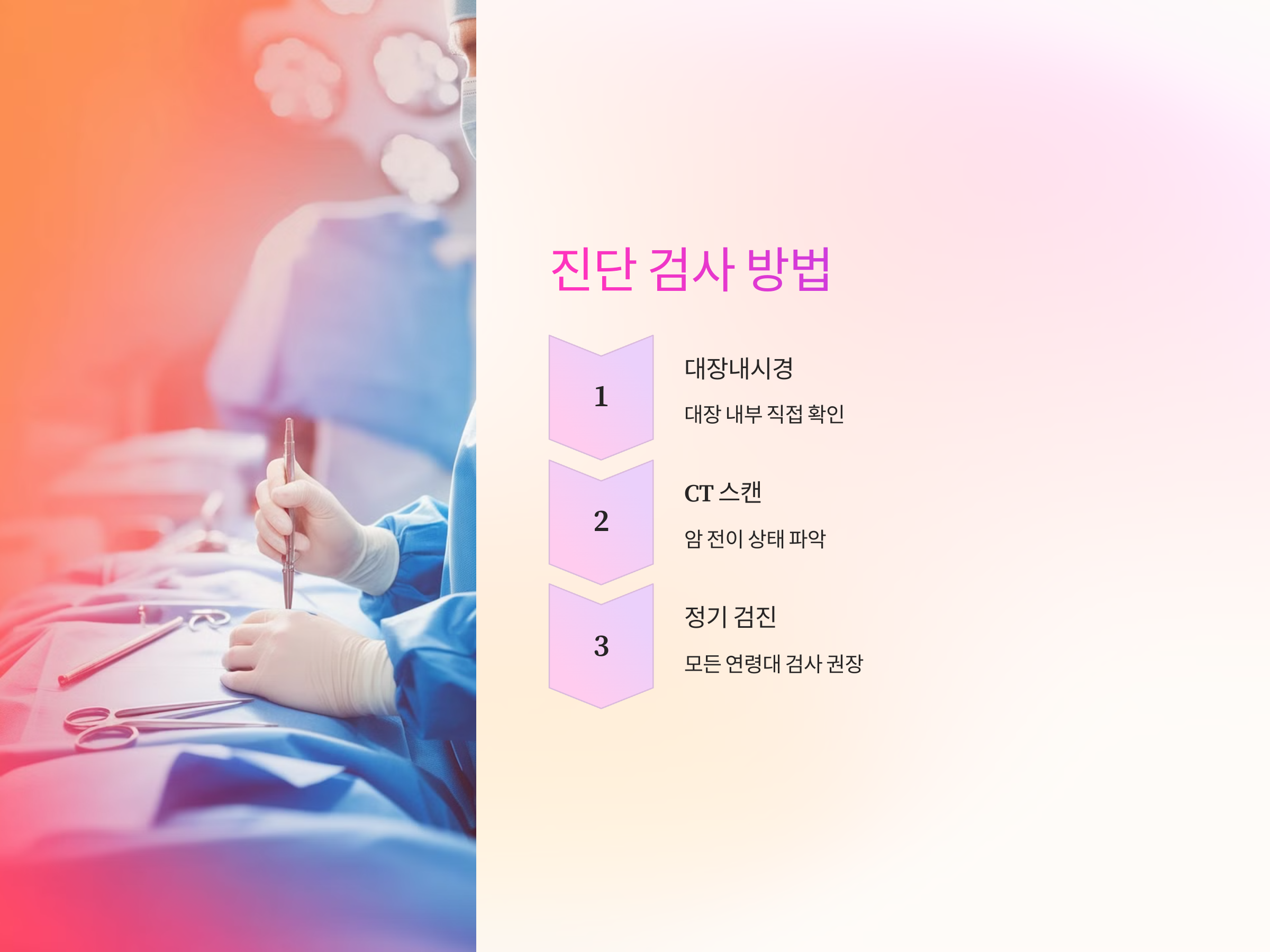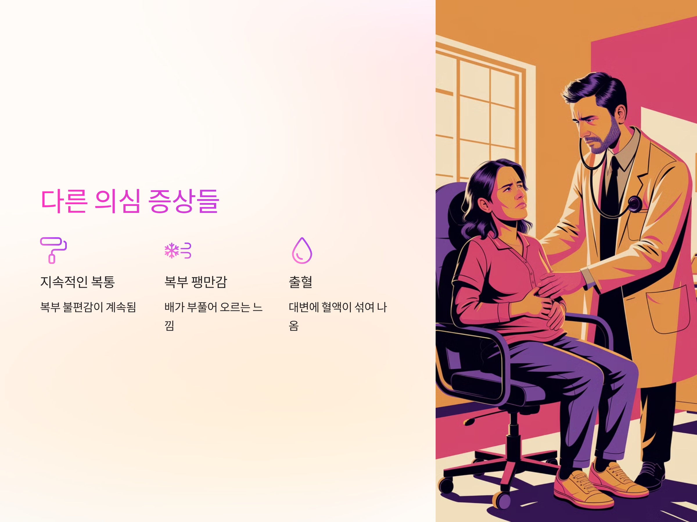 만약 위와 같은 증상들이 발생한다면, 단순한 위장 질환이나 변비 등으로 생각하고 지나치지 말고 전문적인 검사를 받는 것이 중요합니다.