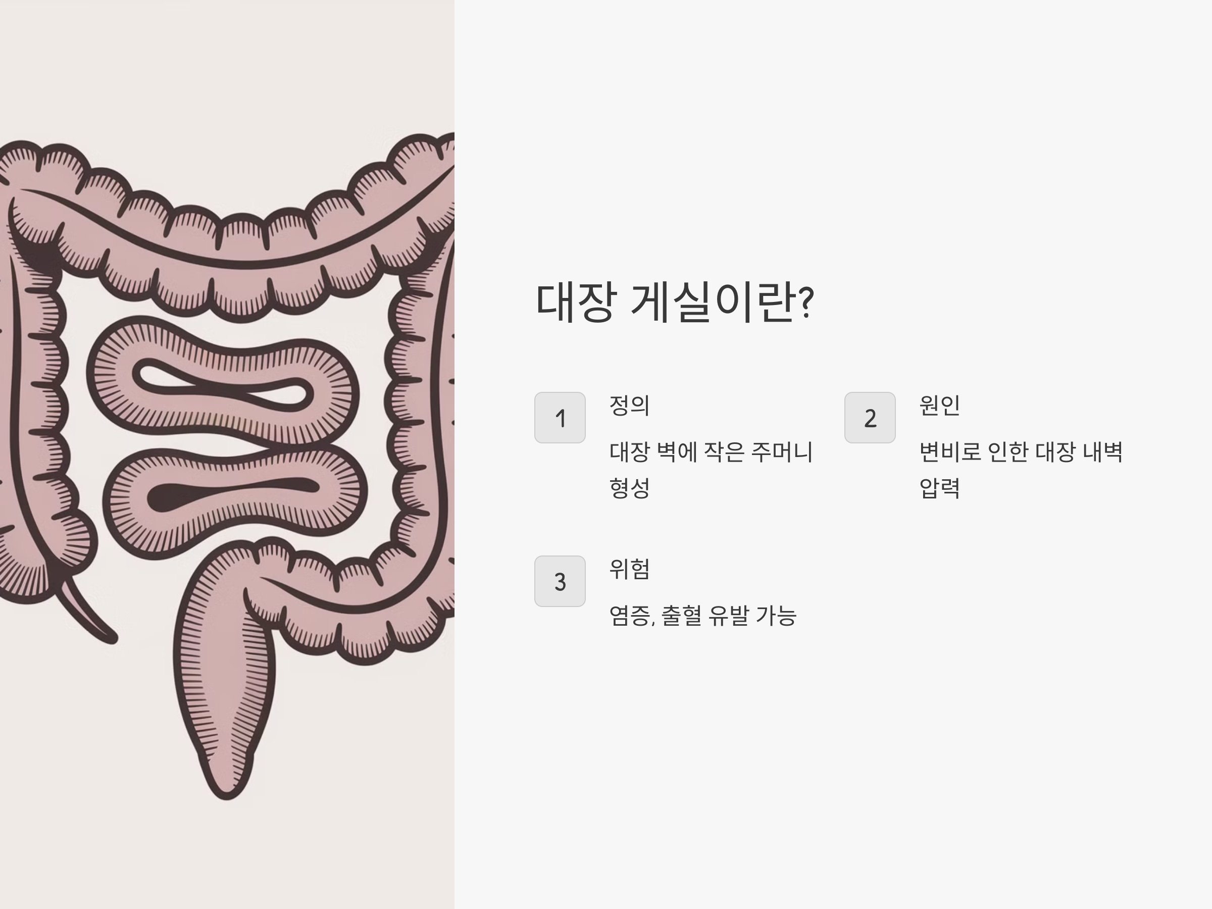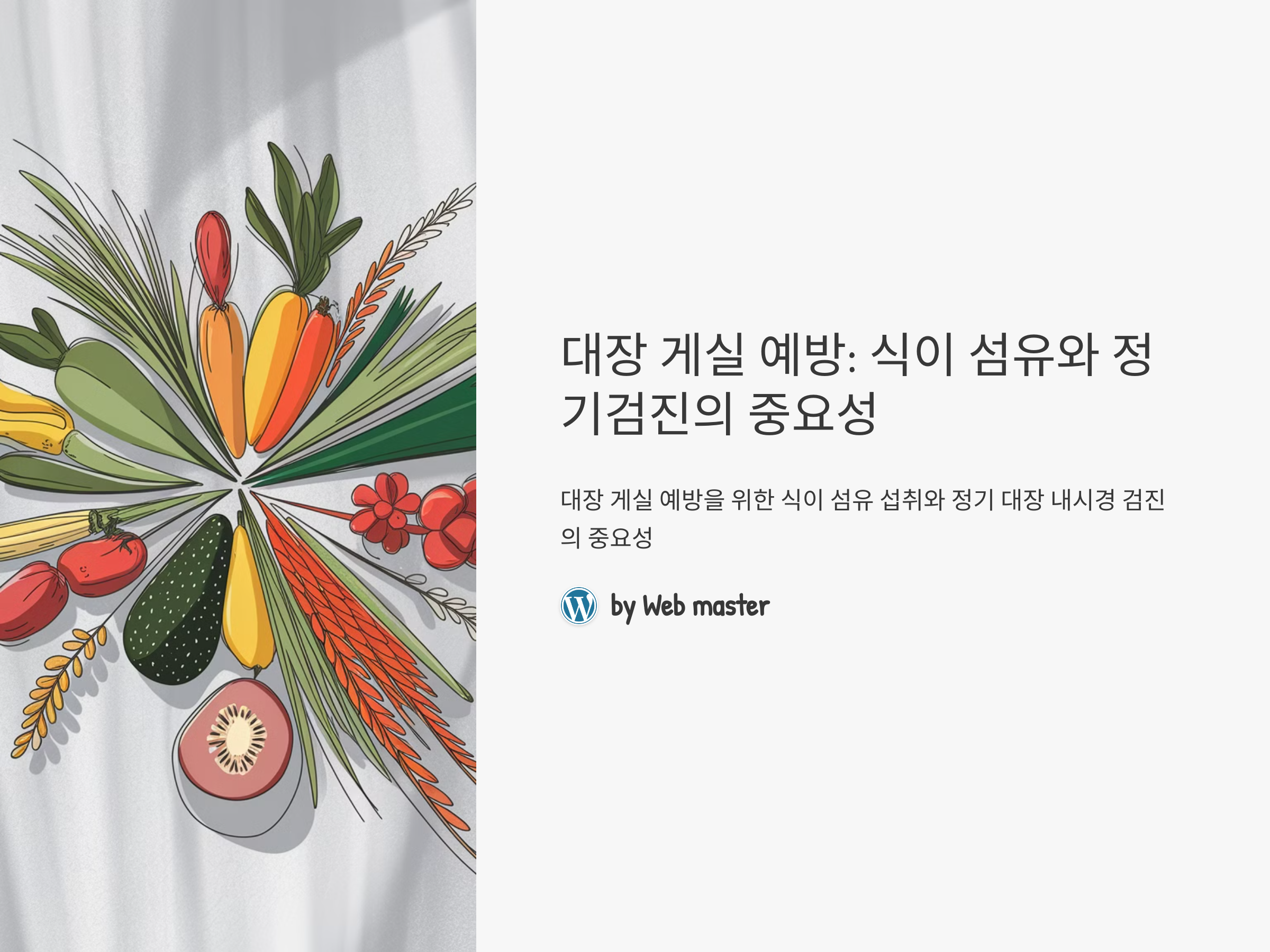 대장 게실 예방을 위한 식이 섬유 섭취와 대장 내시경 정기검진은 대장 건강을 지키는 중요한 두 가지 방법입니다. 식이 섬유를 충분히 섭취하고, 정기적인 검진을 통해 대장 건강을 유지하세요. 건강한 생활습관을 지속적으로 실천하면 대장 게실을 예방하고 건강한 삶을 유지할 수 있습니다.