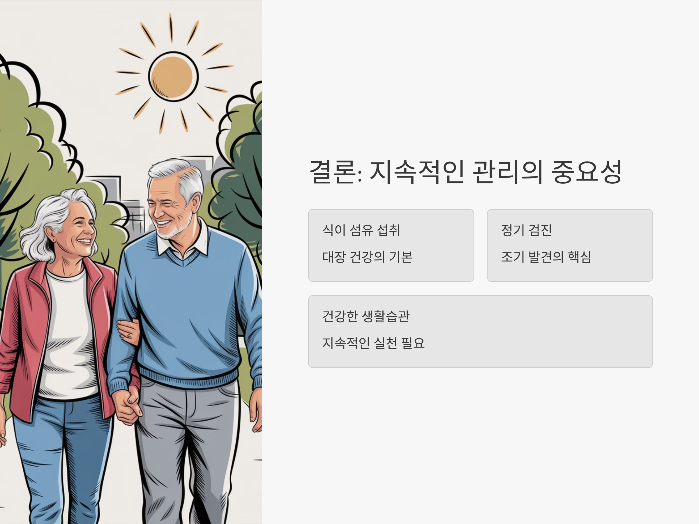 대장 게실 예방은 단기적인 노력으로 끝나는 것이 아니므로, 꾸준한 관리가 필요합니다. 자신의 생활습관을 점검하고, 대장 건강을 위한 습관을 지속적으로 실천해 나가는 것이 중요합니다.