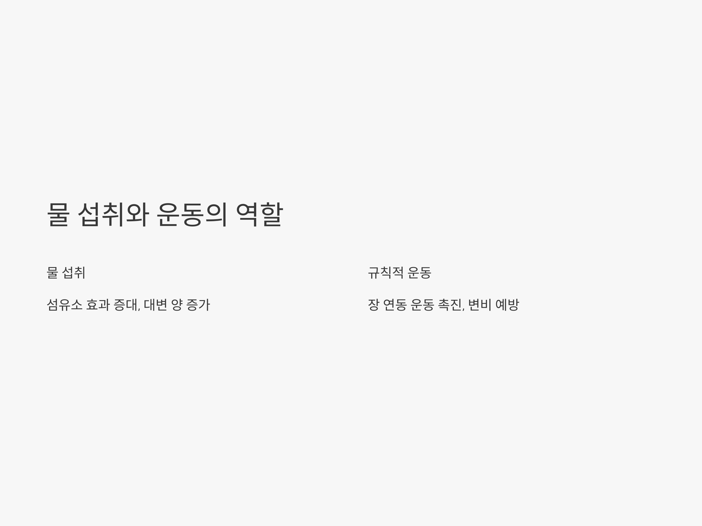 식이 섬유를 섭취하는 것만큼 중요한 또 하나의 예방 방법은 충분한 물 섭취와 규칙적인 운동입니다. 식이 섬유는 물과 함께 대장에서 부풀어 올라 대변의 양을 늘리고 배변을 원활하게 만듭니다. 따라서 물을 충분히 마셔야 섬유소가 대장에서 효과적으로 작용할 수 있습니다.