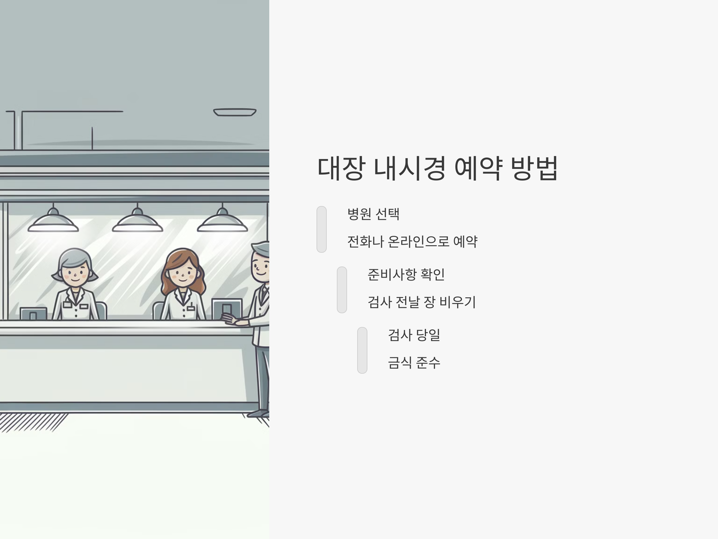 - 검사 전 준비사항을 미리 확인하고 준비합니다. 보통 검사 전날 저녁에 장을 비우기 위한 약물을 복용해야 합니다.