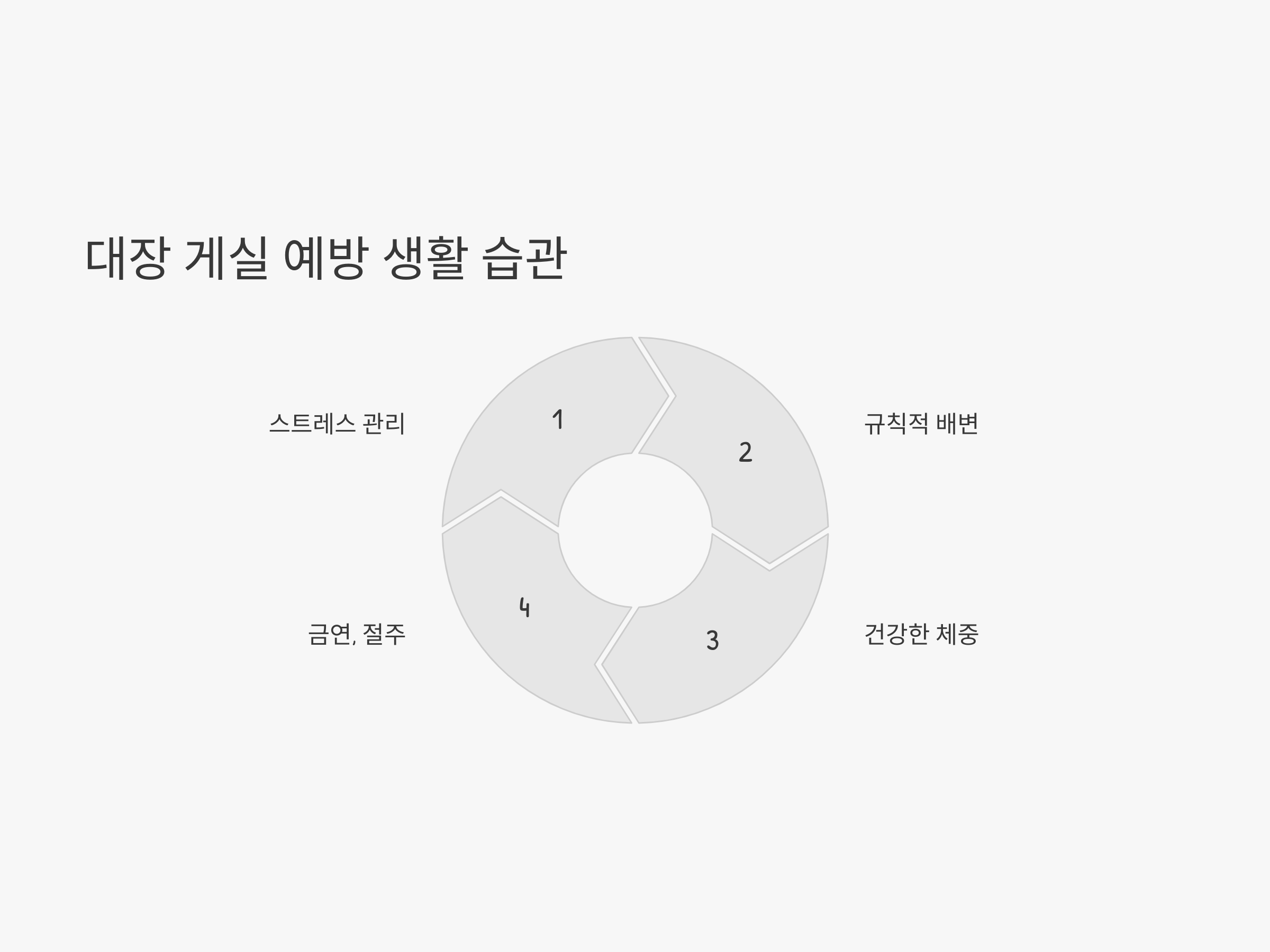 대장 게실 예방을 위해서는 일상생활에서 꾸준히 건강한 생활습관을 유지하는 것이 중요합니다. 평소에 스트레스를 관리하고, 규칙적인 배변습관을 유지하는 것도 중요한 부분입니다. 또한, 과도한 음주와 흡연을 피하고, 건강한 체중을 유지하는 것이 좋습니다.