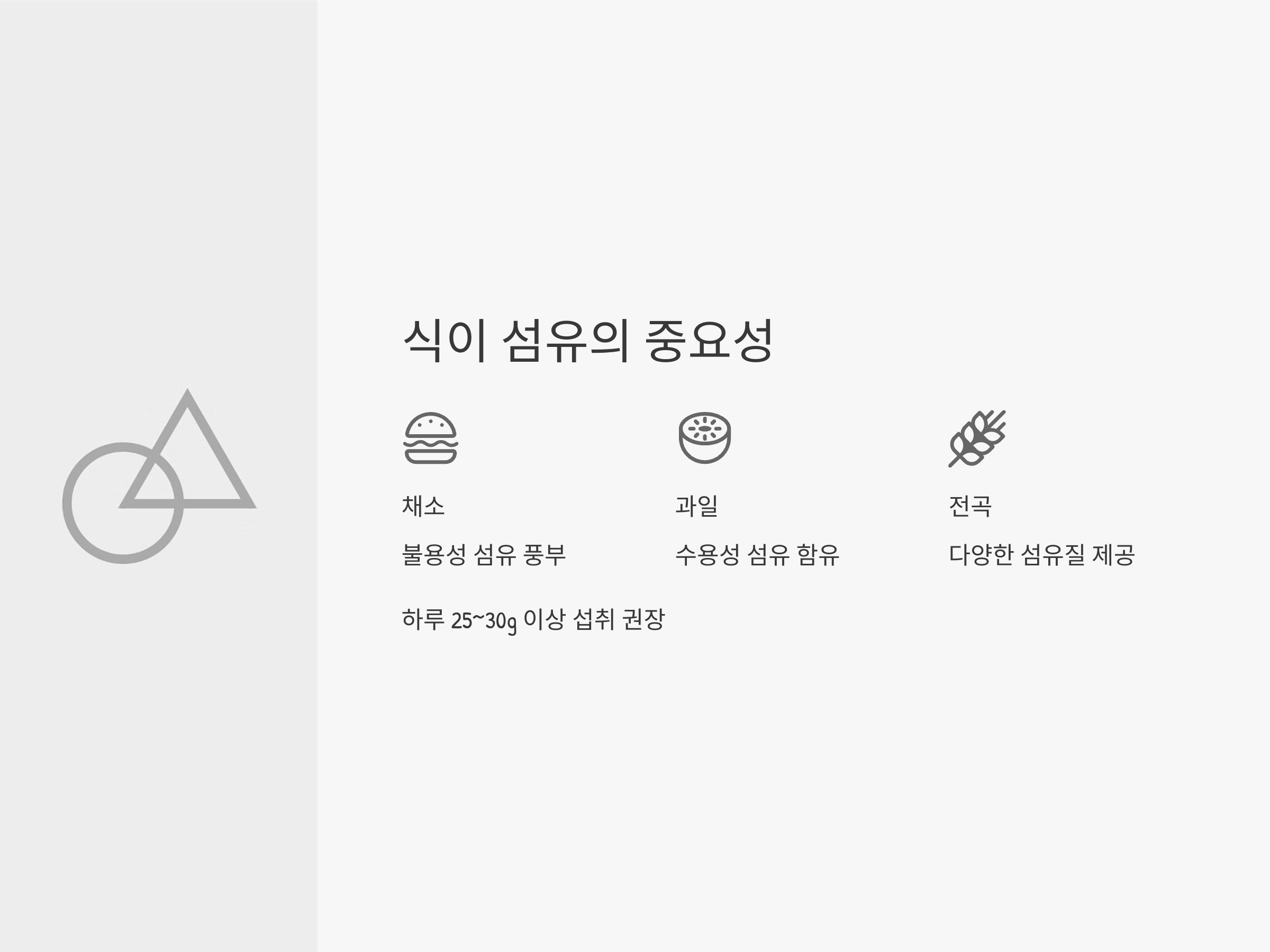 하루에 25~30g 이상의 식이 섬유를 섭취하는 것이 좋으며, 채소, 과일, 전곡, 콩류 등을 식단에 포함시키는 것이 좋습니다.