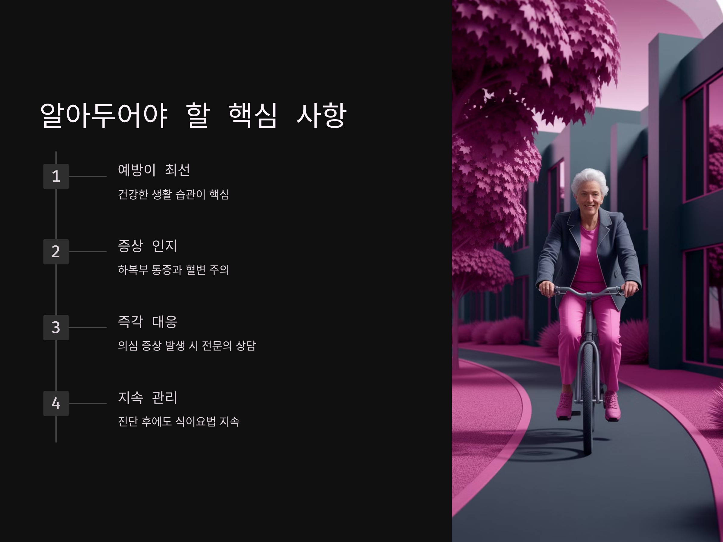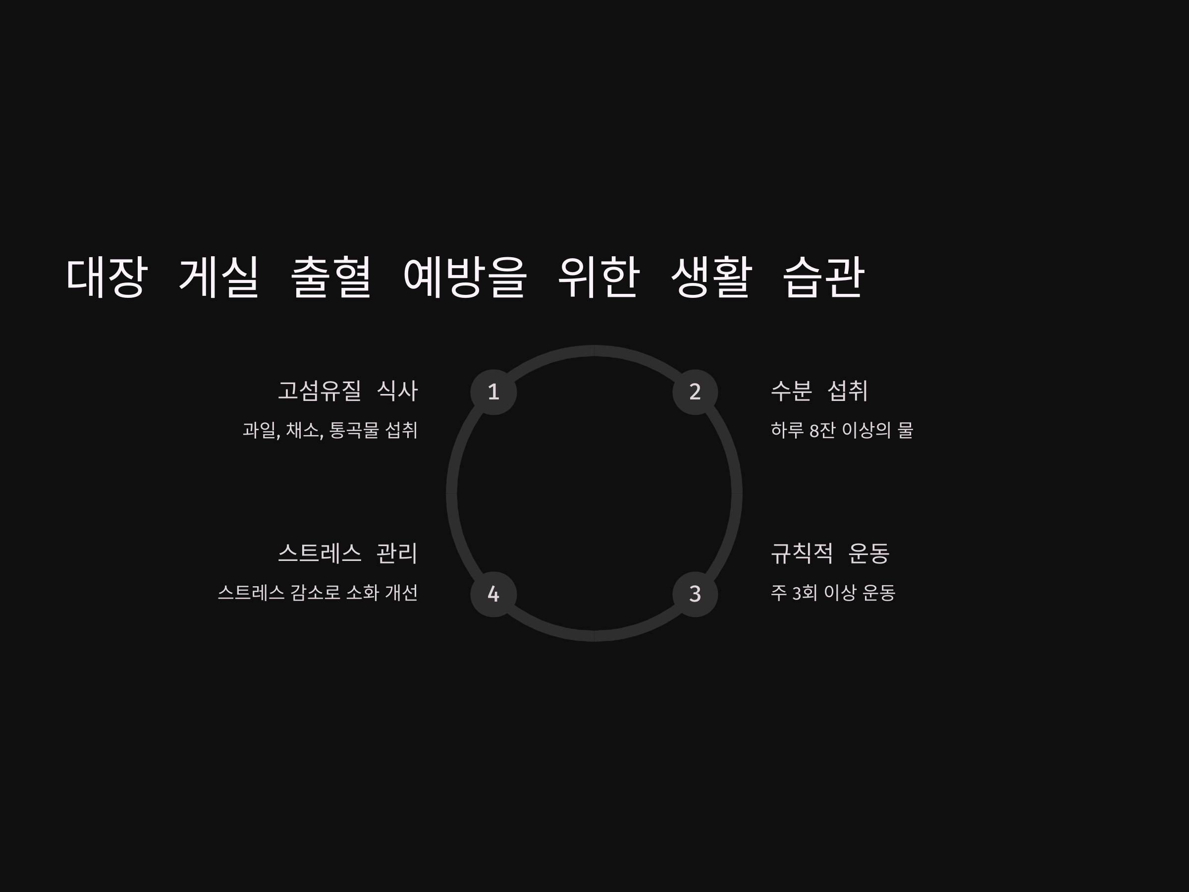 대장 게실 질환을 예방하기 위해서는 규칙적인 운동, 고섬유질 식단, 충분한 수분 섭취 등의 건강한 생활 습관이 필수적입니다. 이를 통해 대장의 압력을 줄이고, 게실이 발생하지 않