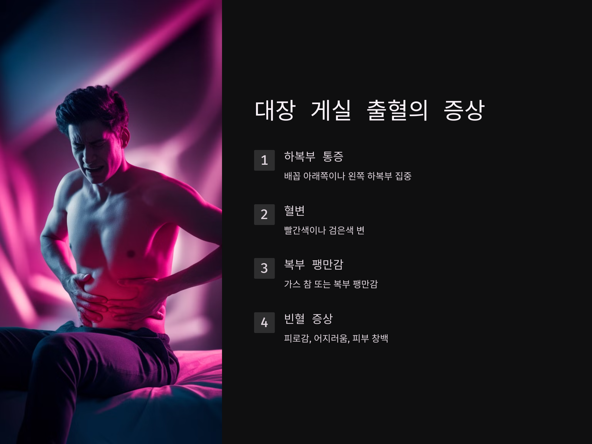 대장 게실 출혈은 대장의 약한 부분에서 발생하는 출혈로, 대부분 하복부 통증을 동반할 수 있습니다. 초기에는 증상이 가벼운 경우도 있지만, 출혈이 심해지거나 반복될 경우에는 치료가 필요합니다. 따라서, 대장 게실 출혈이 의심될 경우 즉시 병원을 방문해 진단을 받는 것이 중요합니다.