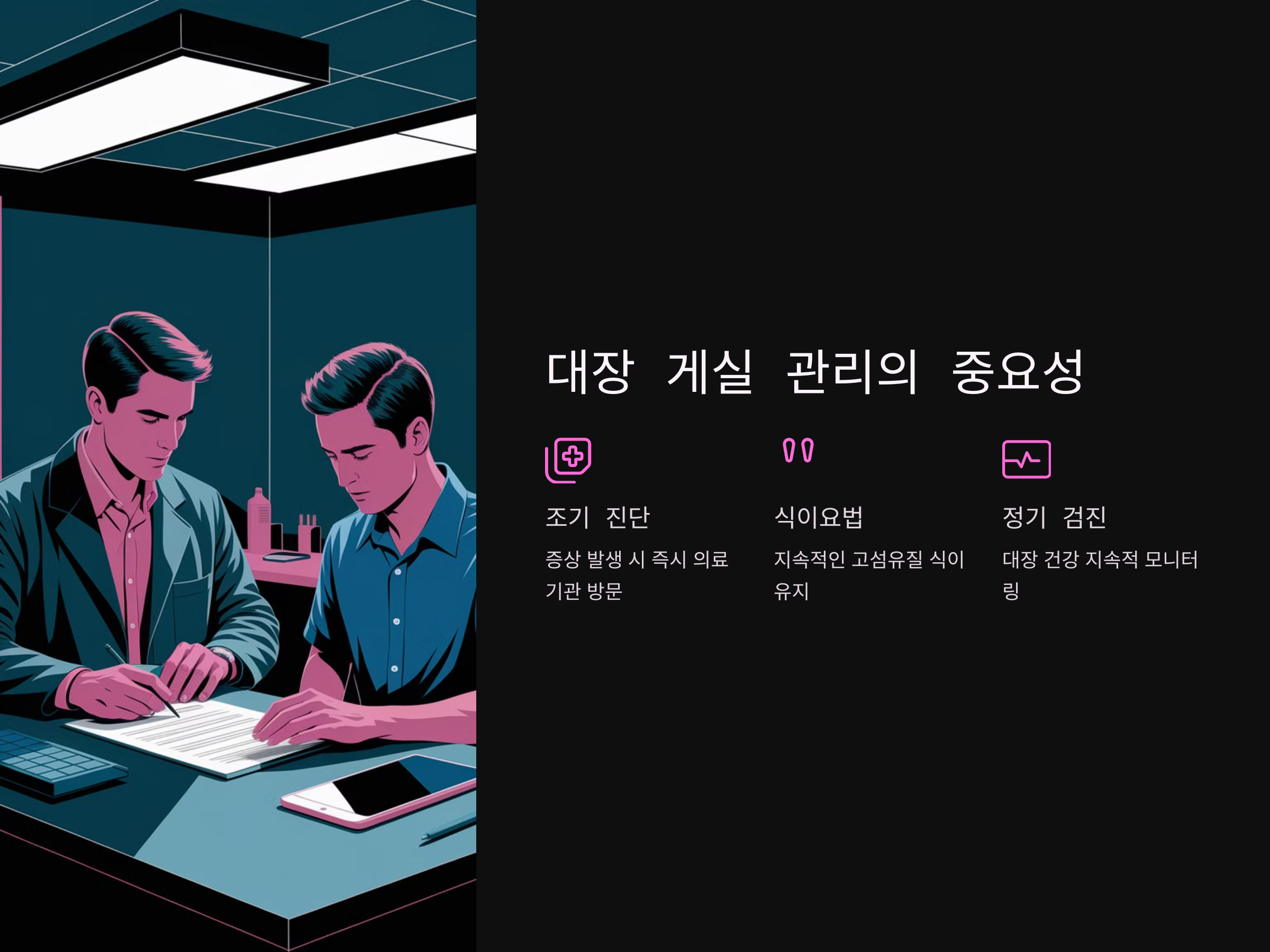 이러한 증상이 나타나면 즉시 의료기관을 방문하여 정확한 진단을 받는 것이 중요합니다. 증상이 가벼워 보이더라도 대장 게실 출혈은 합병증을 유발할 수 있으므로 방치하지 말고 치료를 받는 것이 좋습니다.