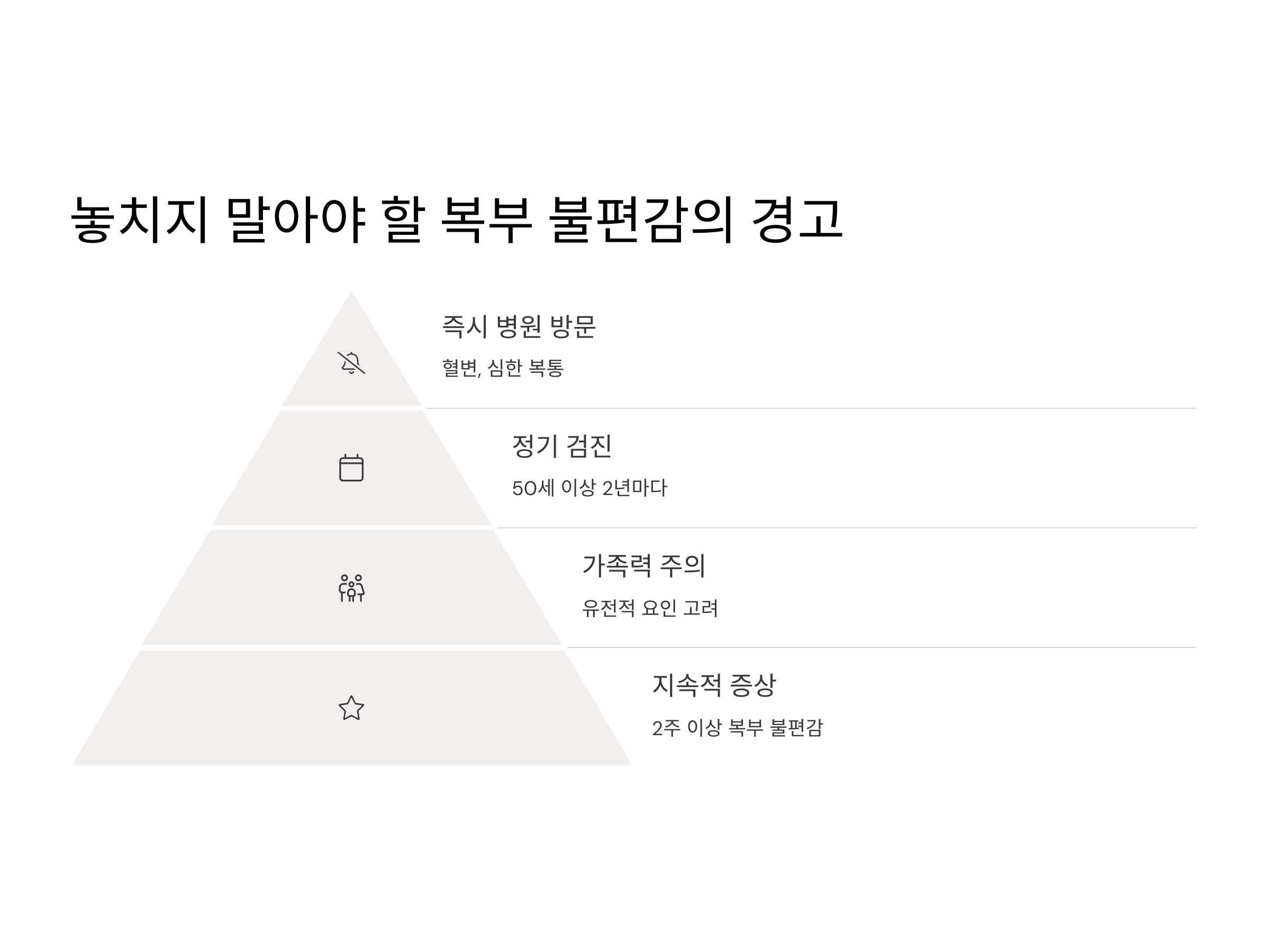 초기 징후로는 갑작스러운 밝은 혈변, 복부 불편감, 설사 혹은 변비의 반복, 복부 팽만감 등이 있으며, 이 중 2가지 이상이 반복된다면 반드시 전문의의 진료를 받아야 합니다.
