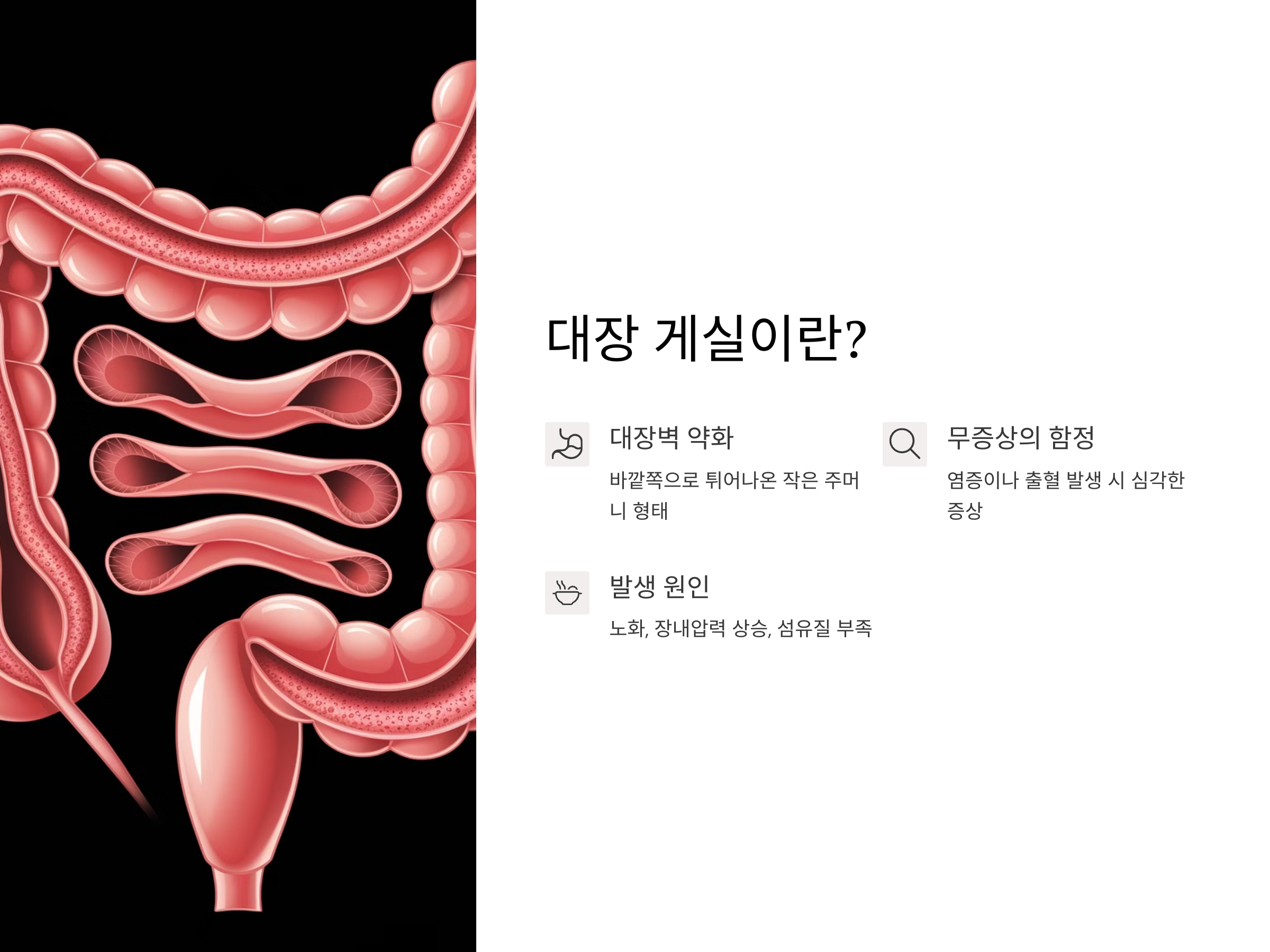 게실은 일반적으로 노화로 인한 장벽 약화, 반복적인 장내 압력 상승, 섬유질 섭취 부족 등으로 인해 생깁니다. 하지만 최근에는 젊은 층에서도 고지방, 고단백 위주의 서구화된 식단으로 인해 그 발생 빈도가 높아지고 있습니다. 따라서 연령대와 관계없이 대장 건강에 관심을 가져야 합니다.