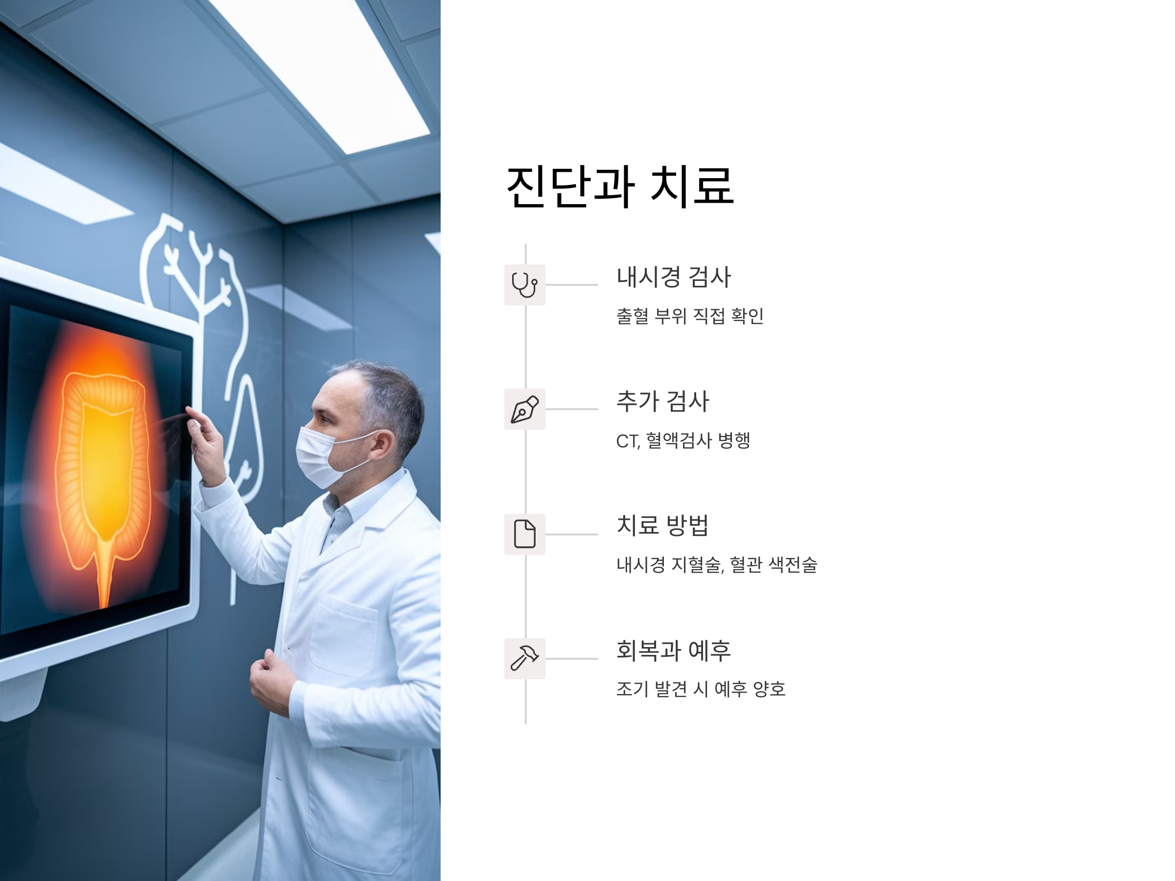 출혈이 경미한 경우 자연 지혈을 기대하며 수분 공급과 휴식을 취하게 되지만, 반복적이거나 양이 많을 경우 내시경 지혈술, 드물게는 수술까지도 고려해야 합니다. 최근에는 혈관 색전술이라는 비침습적 치료도 도입되어 출혈 부위를 효과적으로 막을 수 있습니다. 이러한 치료는 환자의 회복 속도를 높이고 재발 가능성을 낮추는 데 매우 효과적입니다.