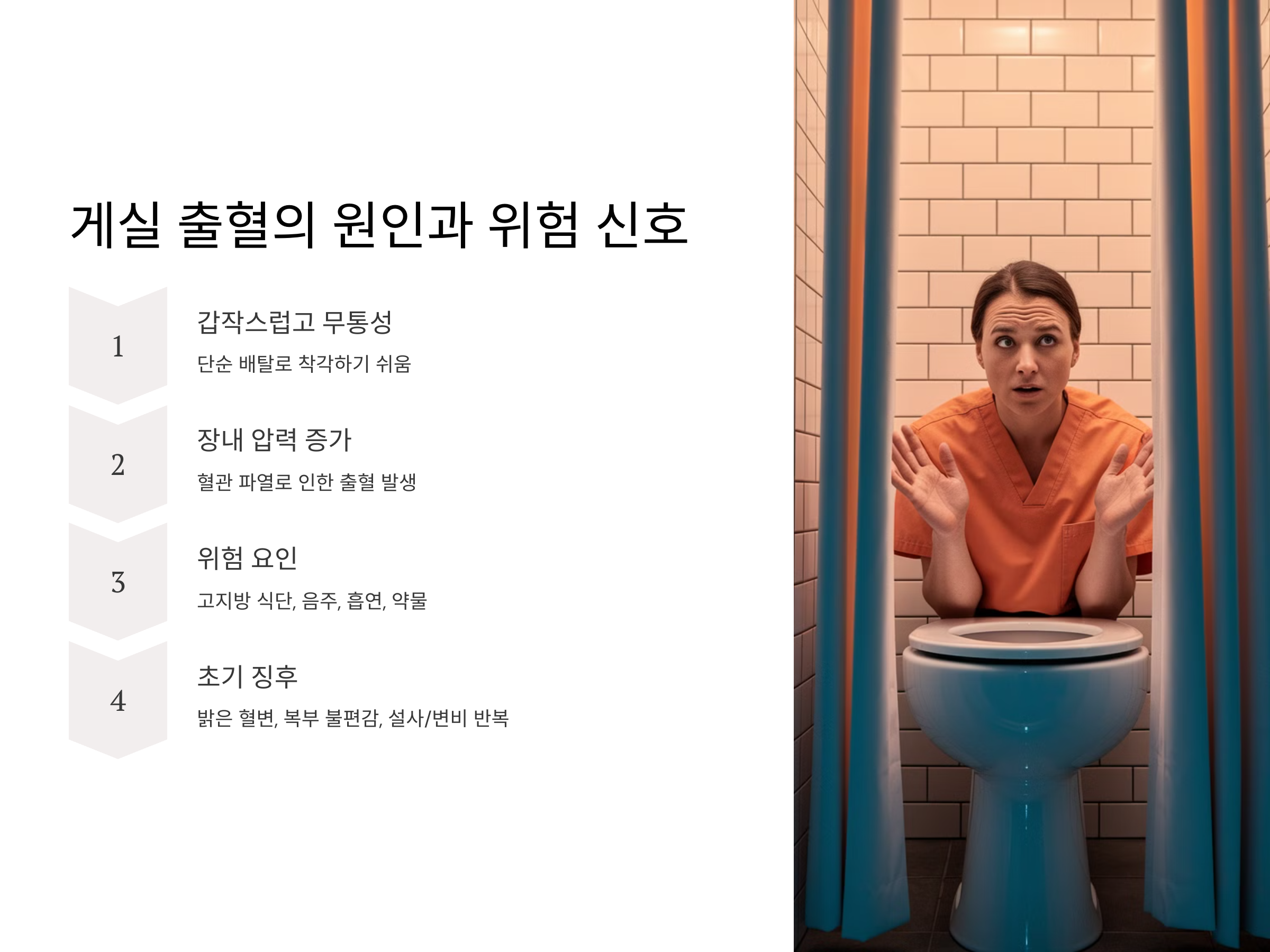 대장 게실은 대장 벽이 약해지면서 바깥쪽으로 튀어나온 작은 주머니 형태의 구조물입니다. 대개 좌측 대장에 많이 발생하며, 평소에는 아무런 증상 없이 존재합니다. 문제는 이 게실이 때때로 염증을 일으키거나 출혈을 유발할 수 있다는 점입니다. 흔히 ‘게실염’으로 알려진 이 상태는 고열, 복통, 메스꺼움 등의 증상을 동반하며, 특히 출혈이 발생하면 검붉거나 밝은 피가 대변에 섞여 나오는 형태로 나타날 수 있습니다.