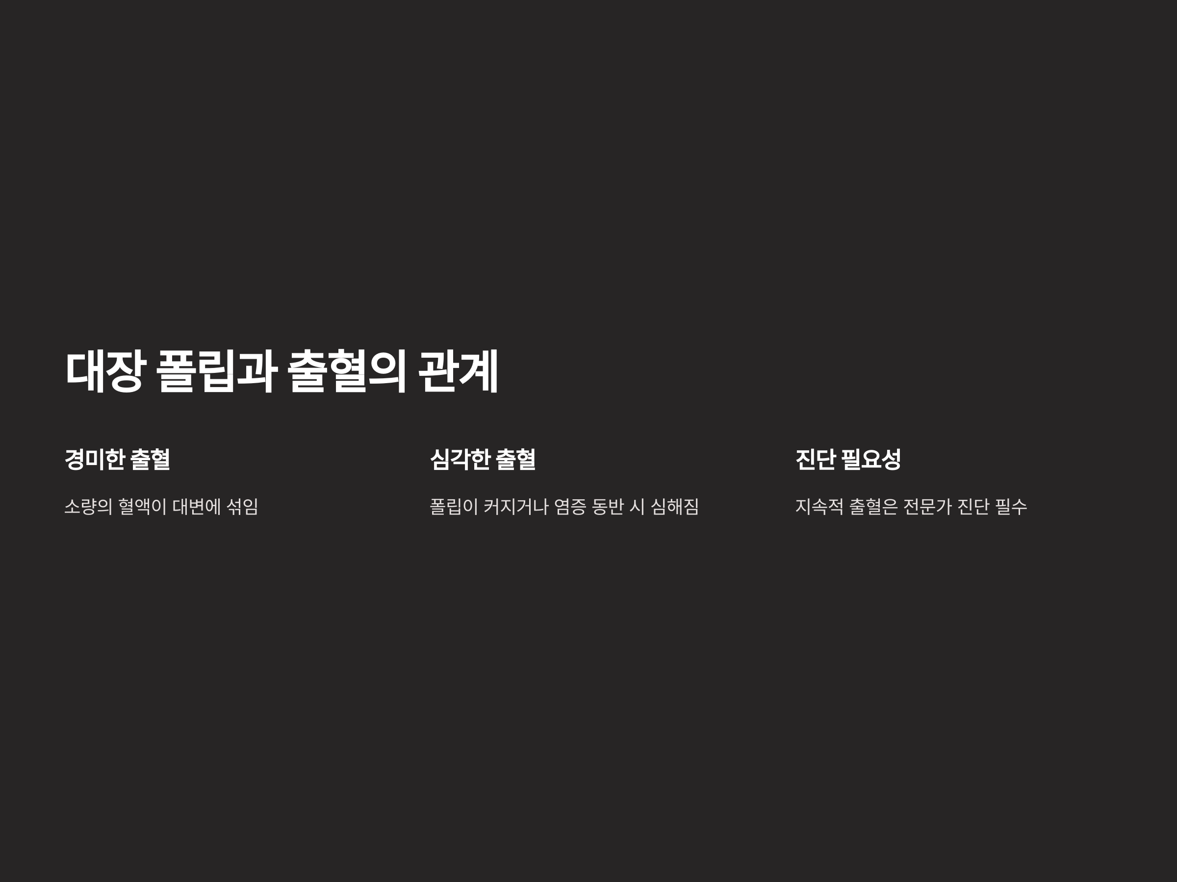 대장 폴립은 증상이 거의 없는 경우가 많지만, 출혈과 배변 습관의 변화가 나타날 수 있습니다. 이러한 변화가 나타났다면, 즉시 의사와 상담하고 대장 내시경 검사를 받는 것이 중요합니다. 대장 폴립은 초기에 발견하고 치료하면 큰 문제 없이 관리할 수 있지만, 이를 무시하면 대장암으로 발전할 수 있습니다.