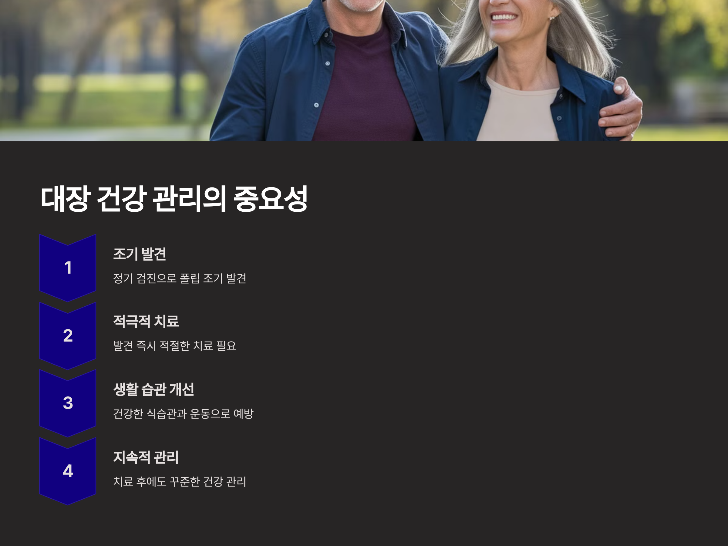 대장 폴립이 발견되었을 때의 치료는 매우 중요하지만, 예방이 가장 중요한 단계입니다. 따라서 대장 건강을 꾸준히 체크하고, 초기 증상이 나타나면 바로 전문가와 상담하는 것이 좋습니다.