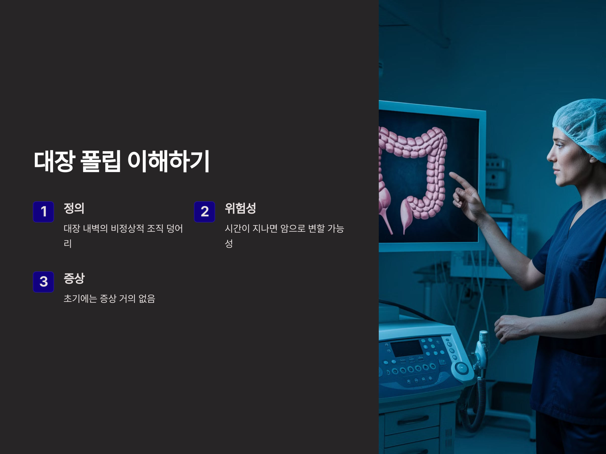 대장 폴립이 발견되었을 때, 가장 중요한 것은 그 종류에 따라 발생할 수 있는 대장암의 위험을 인지하는 것입니다. 대장 폴립 중 일부는 시간이 지나면서 암으로 변할 수 있기 때문에, 이를 예방하고 조기에 치료하는 것이 매우 중요합니다.
