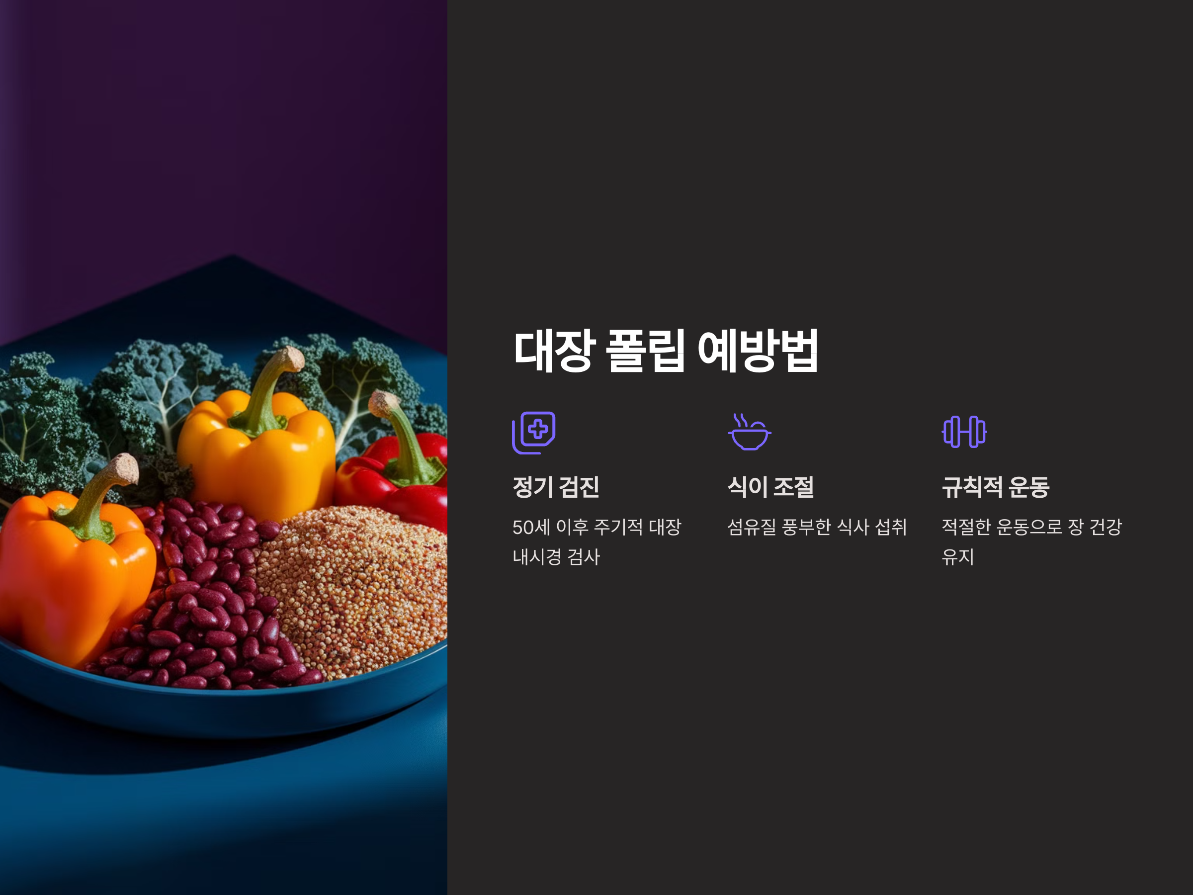 정기적인 검진과 건강한 생활 습관을 통해 대장 폴립을 예방하고, 건강한 대장을 유지하는 것이 중요합니다. 대장 건강에 대해 인식하고, 증상이 나타날 경우 즉시 전문가의 도움을 받는 것이 건강을 지키는 첫걸음입니다.