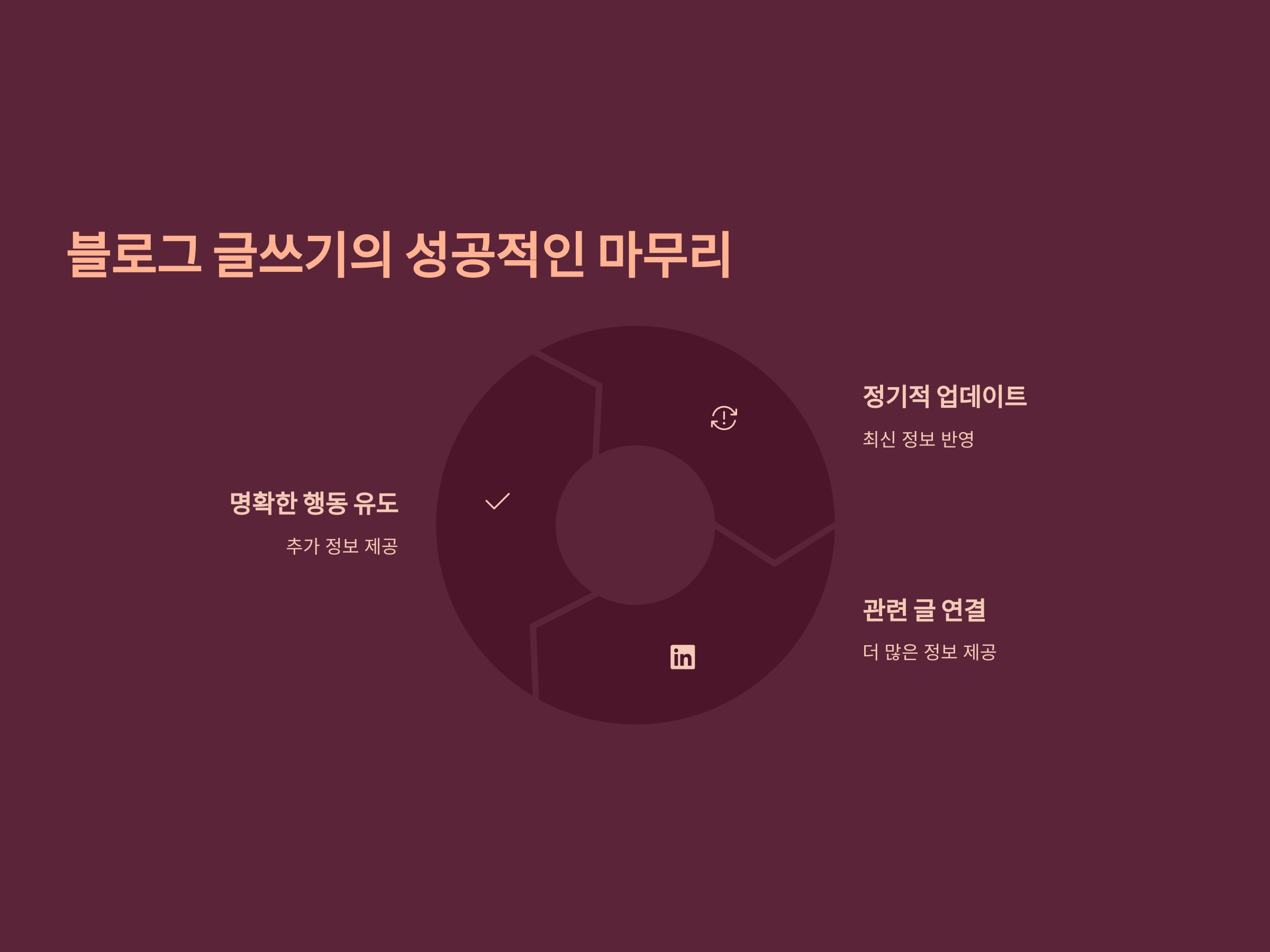 블로그 글을 마무리할 때는 독자에게 명확한 행동을 유도하는 것이 중요합니다. 결론 부분에서 독자에게 추가적인 정보를 제공하거나, 관련된 자료를 클릭하도록 유도하는 문구를 넣어야 합니다. 예를 들어, 글을 마친 후 "다른 관련 글을 읽어보세요" 또는 "이와 관련된 자료를 참고하세요" 등의 링크를 추가하여, 독자가 더 많은 정보를 얻을 수 있도록 유도합니다.