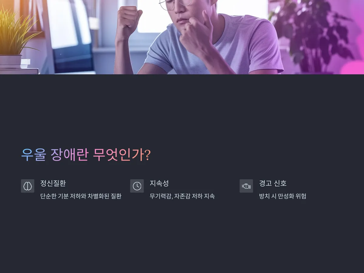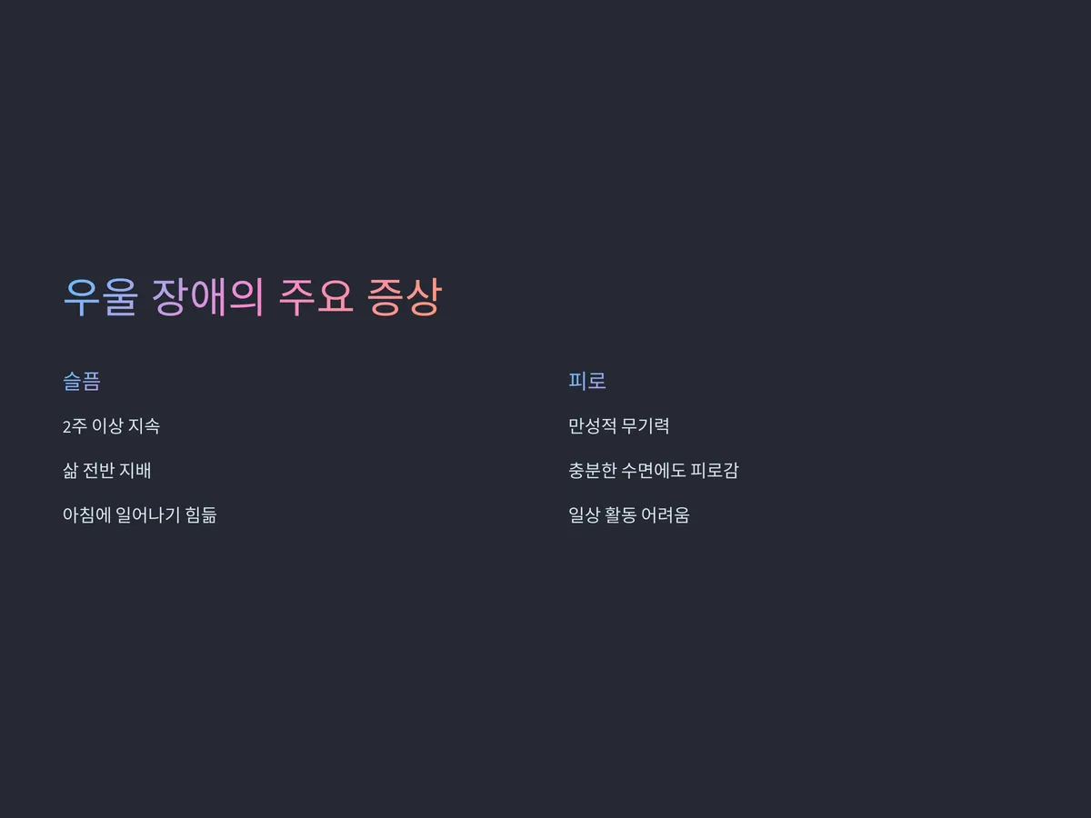 특히 지속적 피로와 슬픔을 중심으로 한 우울 장애는 초기 발견과 치료가 매우 중요합니다. 방치될 경우 자살 위험까지 동반될 수 있으므로, 주변인의 관심과 조기개입이 무엇보다도 필요합니다.