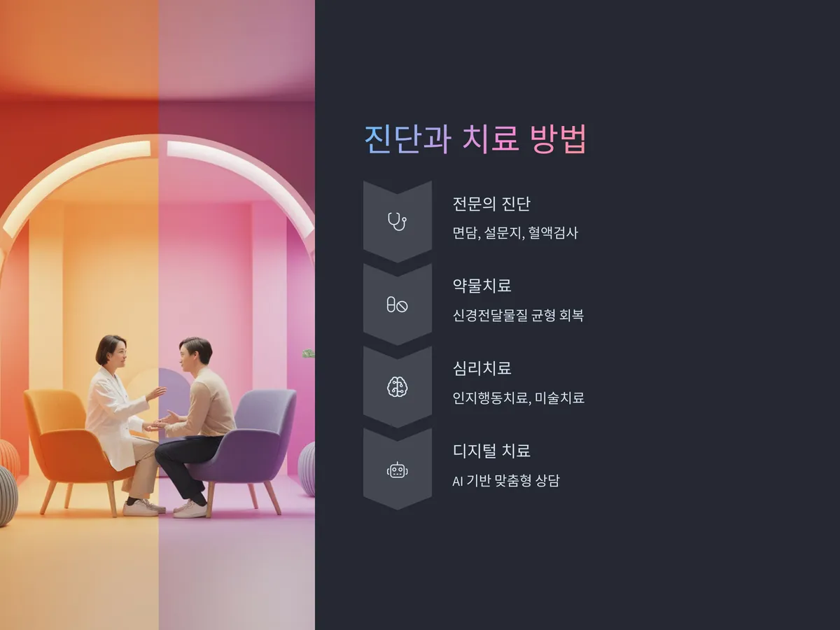 우울 장애는 DSM-5 기준에 따라 정신건강의학과 전문의가 면담 및 설문지, 필요 시 혈액검사 등을 통해 진단합니다. 진단 후에는 약물치료, 인지행동치료, 미술치료, 운동요법 등이 병행되며, 최근에는 디지털 치료제와 AI 기반 맞춤형 상담 시스템도 활발히 도입되고 있습니다.