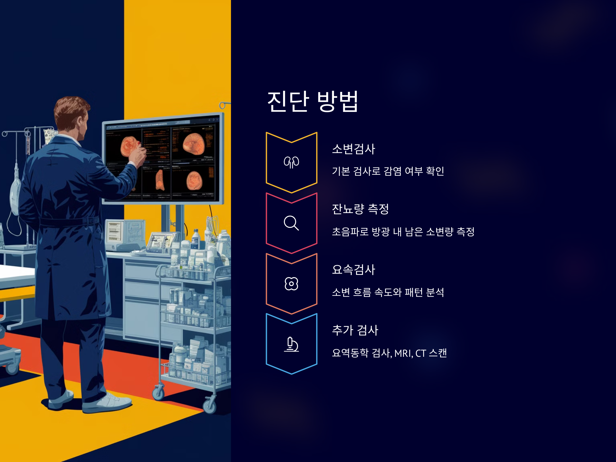 방광 기능 저하를 진단하기 위해선 여러 검사가 필요합니다. 일반적으로 가장 먼저 시행되는 검사는 소변검사와 잔뇨량 측정입니다. 잔뇨량은 초음파를 통해 방광 내 남아있는 소변의 양을 측정하는 방식으로 이루어집니다.