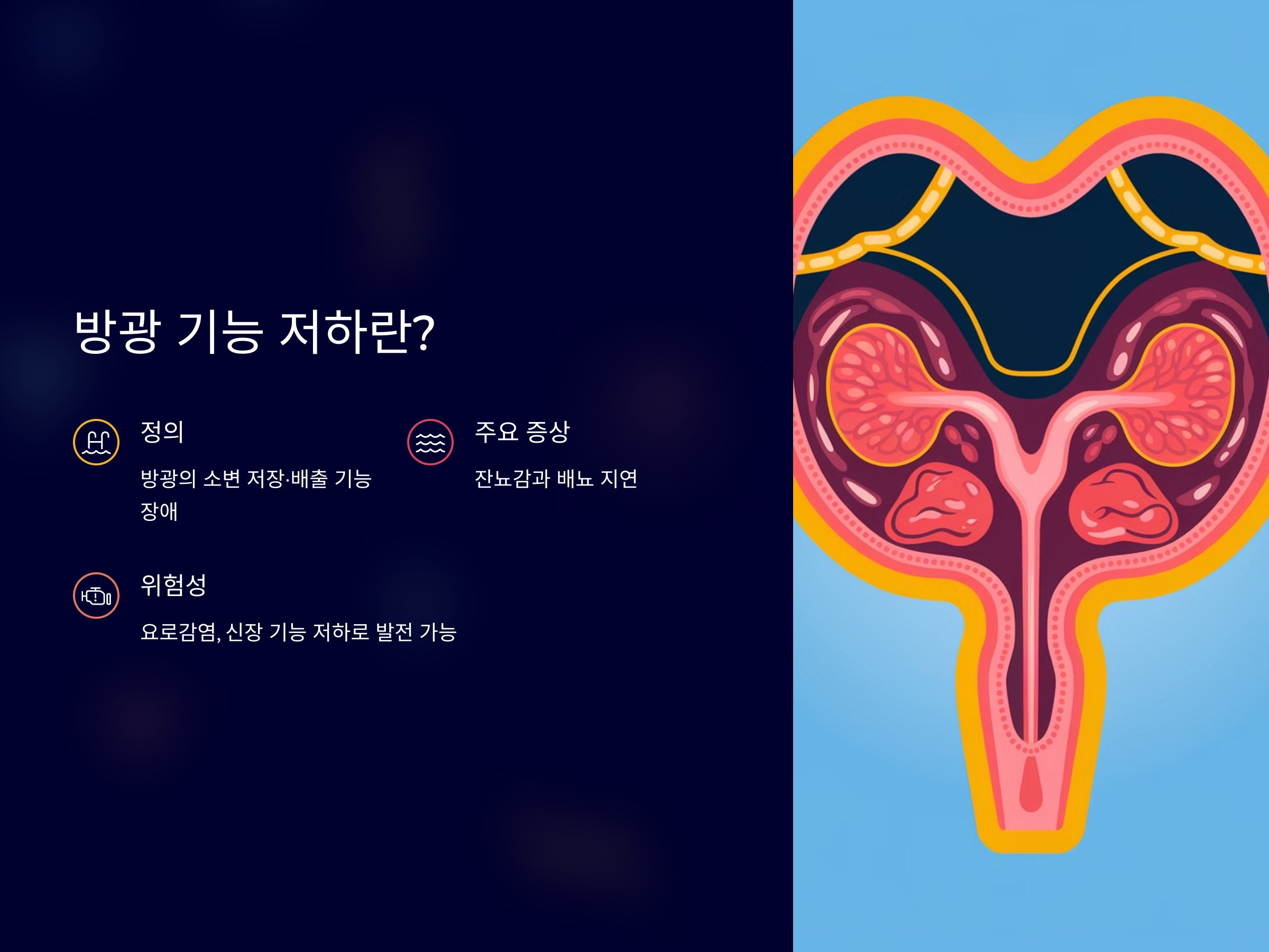 방광 기능 저하란 방광이 정상적으로 소변을 저장하거나 배출하는 기능에 장애가 생긴 상태를 의미합니다. 이로 인해 환자들은 소변을 참기 어렵거나, 반대로 시원하게 소변을 보지 못하는 상황을 겪게 됩니다. 가장 흔한 증상은 바로 '잔뇨감'과 '배뇨 지연'으로, 화장실을 다녀온 뒤에도 여전히 소변이 남아 있는 듯한 느낌이 들거나, 소변을 보려는 의지가 있어도 바로 나오지 않고 시간이 지체되는 경우입니다.