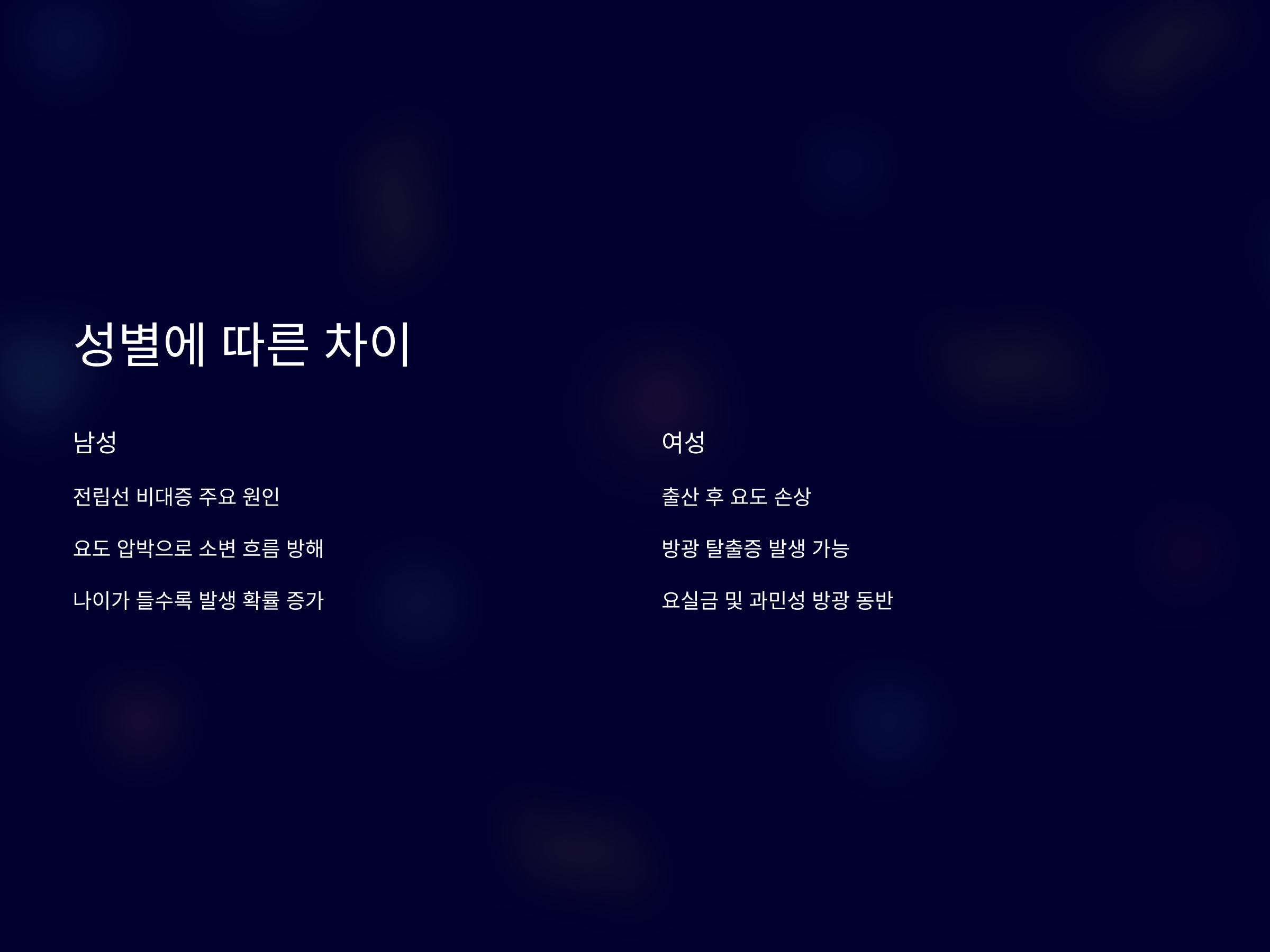 이러한 증상은 단순히 수분 섭취 문제나 생활습관 때문이 아니라, 신경학적 손상, 전립선 비대증, 과민성 방광, 요도 협착 등 다양한 요인으로 인해 발생할 수 있습니다. 특히 나이가 들수록 이러한 기능 저하가 발생할 확률이 높아지며, 여성보다는 남성에게 더 흔하게 나타나는 경향이 있습니다.