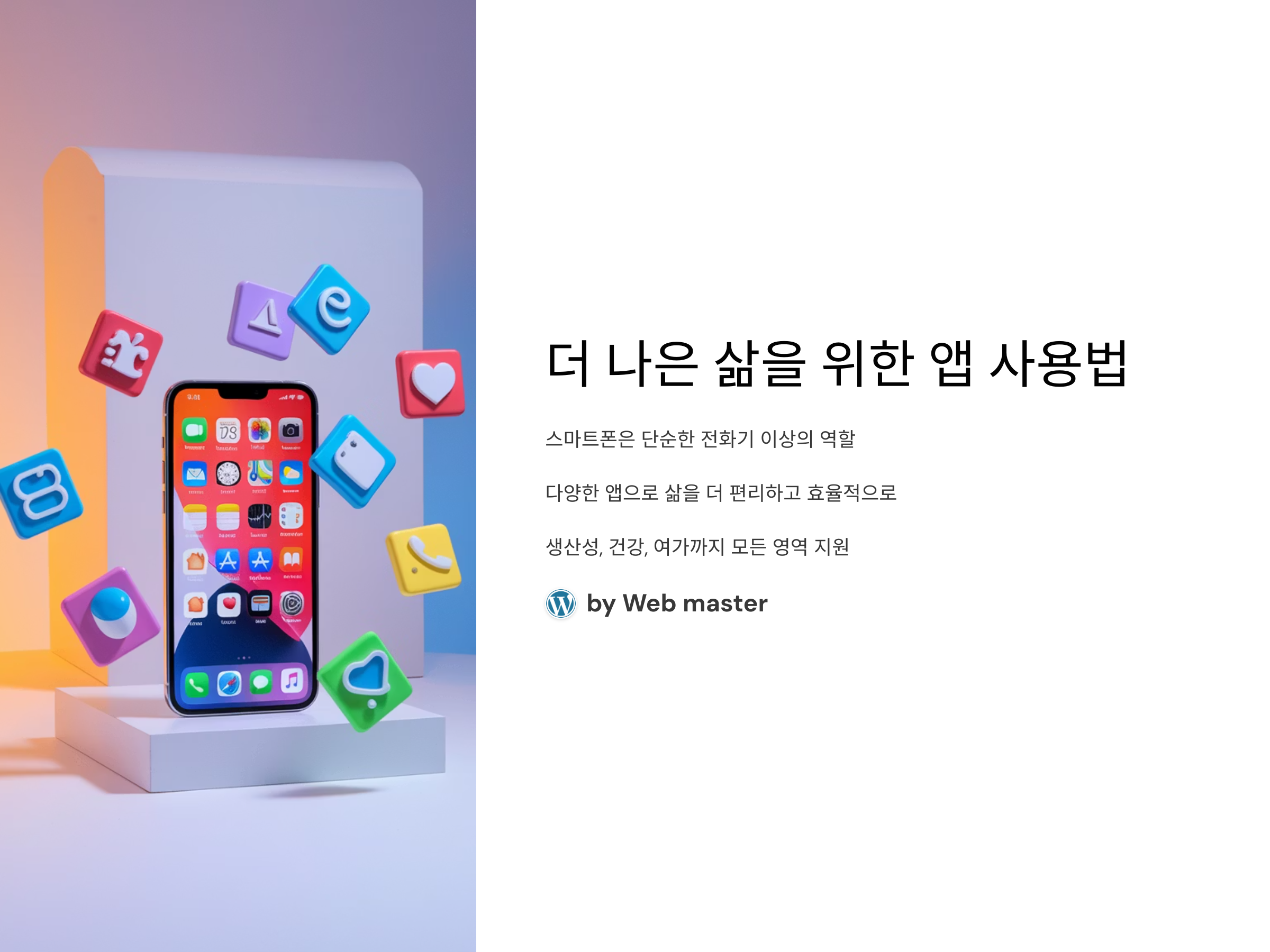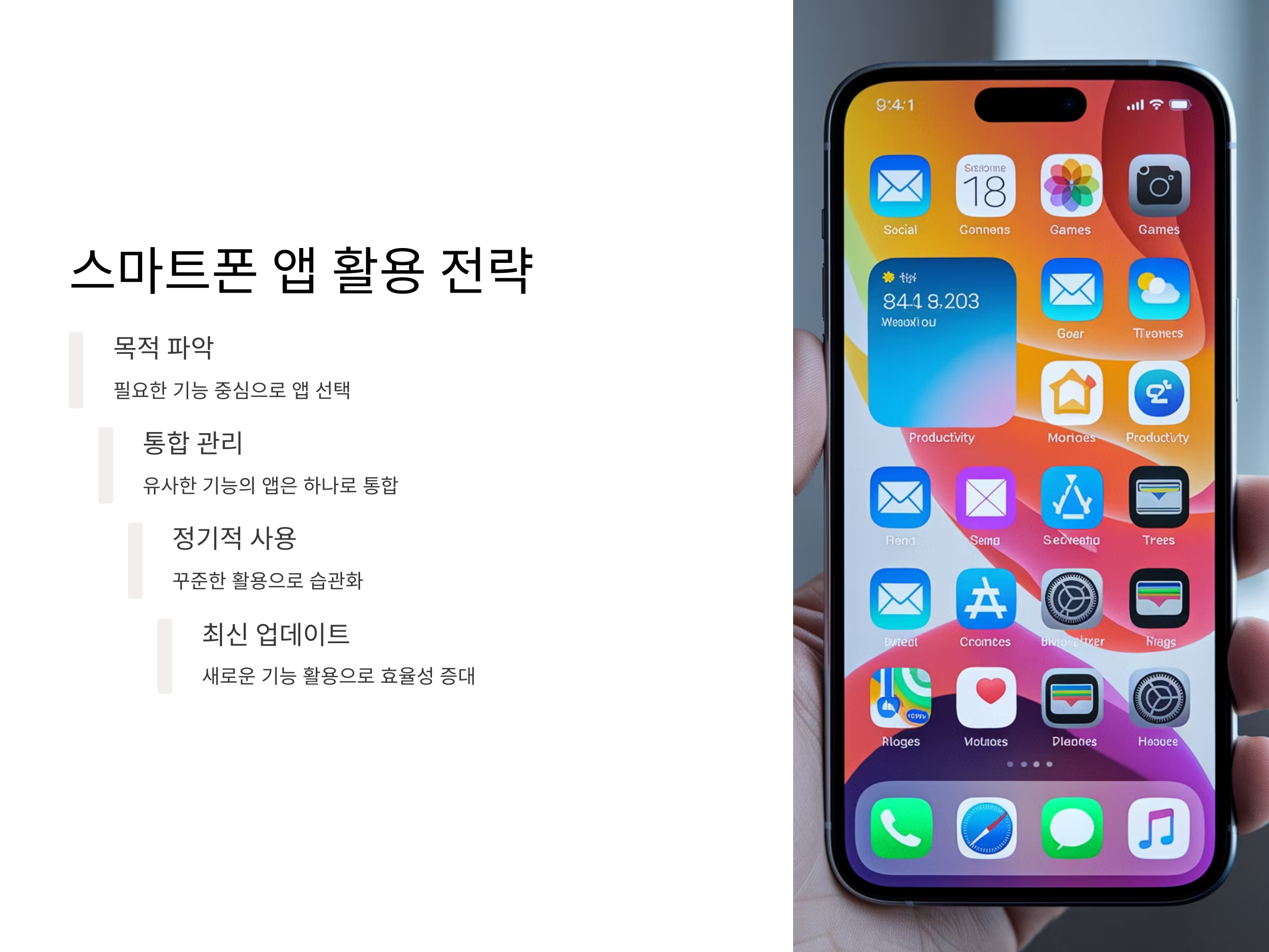 이와 같이 다양한 앱들을 활용하면 스마트폰이 우리의 일상에서 더 유용한 도구가 될 수 있습니다. 생산성, 건강, 여가, 금융 등 각 분야에서 스마트폰을 활용하는 방법은 무궁무진하며, 이를 통해 더 나은 삶을 살 수 있습니다. 이제 스마트폰을 단순한 연락용 도구가 아닌, 효율적인 일상 관리 도구로 사용해 보세요!