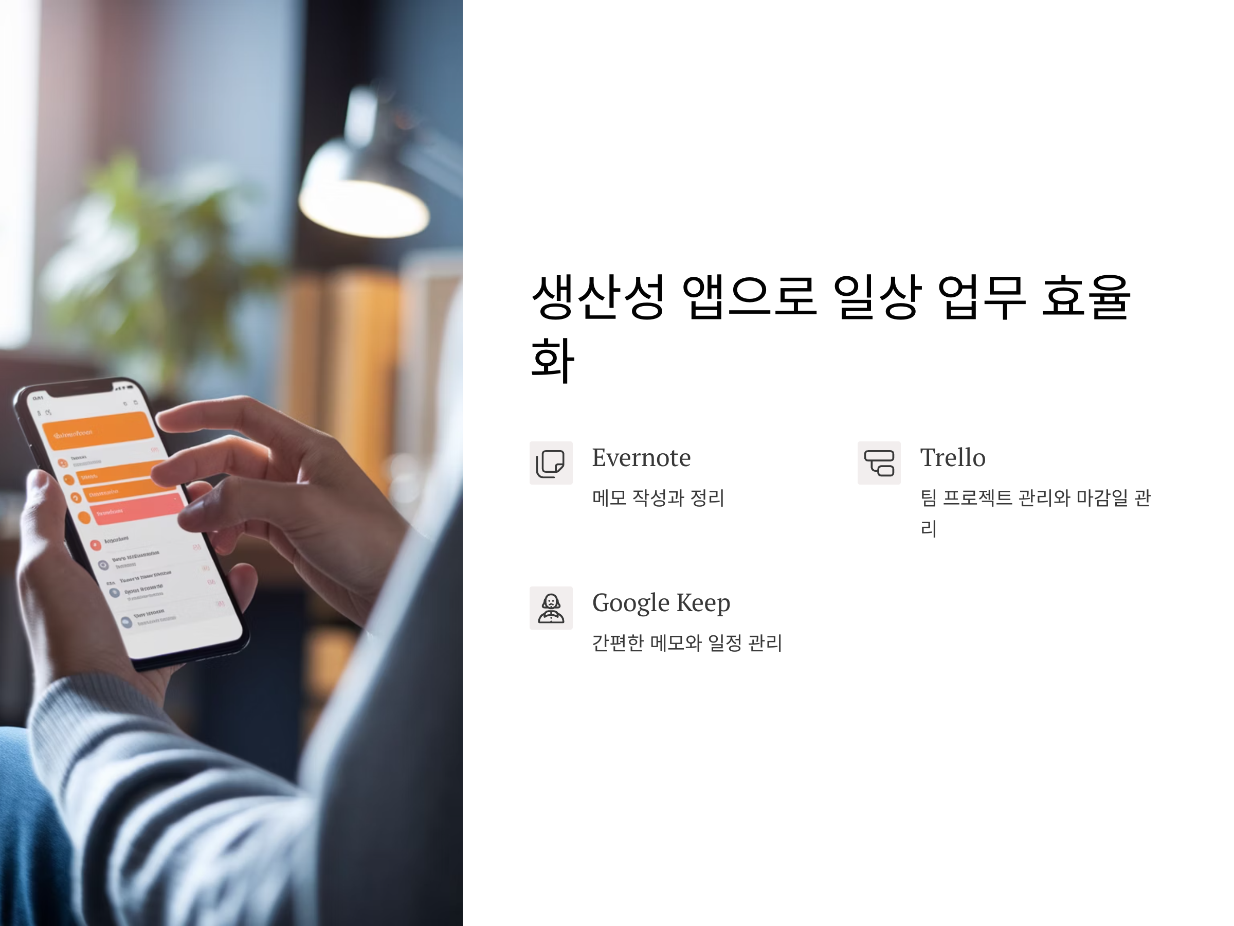 스마트폰을 통해 업무를 처리하는 것이 점점 더 중요해지고 있습니다. 특히 효율적인 시간 관리와 업무 처리를 위한 앱들은 우리의 일상에 필수적인 도구가 되었습니다. 대표적인 앱인 Evernote, Trello, Google Keep 등은 여러분이 업무를 더 효율적으로 처리할 수 있도록 돕습니다. 이 앱들은 메모를 작성하고, 일정을 관리하며, 프로젝트를 체계적으로 진행하는 데 유용합니다.