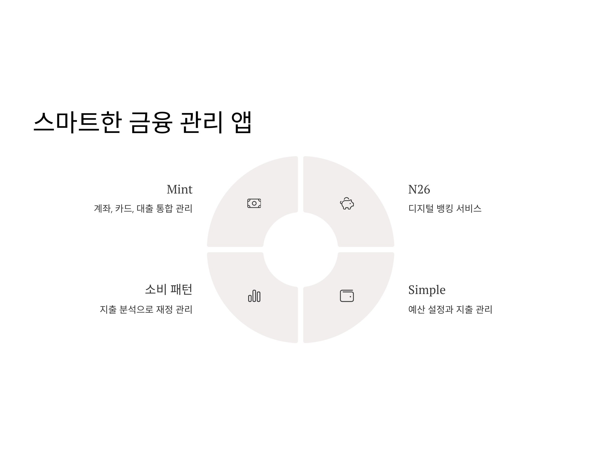 스마트폰을 통한 금융 관리도 이제는 필수적입니다. Mint, N26, Simple 같은 앱들은 개인 금융을 관리하고 예산을 설정하는 데 유용한 도구들입니다. 이러한 앱들을 사용하면 소비 내역을 추적하고, 예산을 관리하는 데 도움을 받을 수 있습니다. 특히, Mint는 한 곳에서 은행 계좌, 신용카드, 대출 등을 모두 확인할 수 있어 매우 편리합니다.