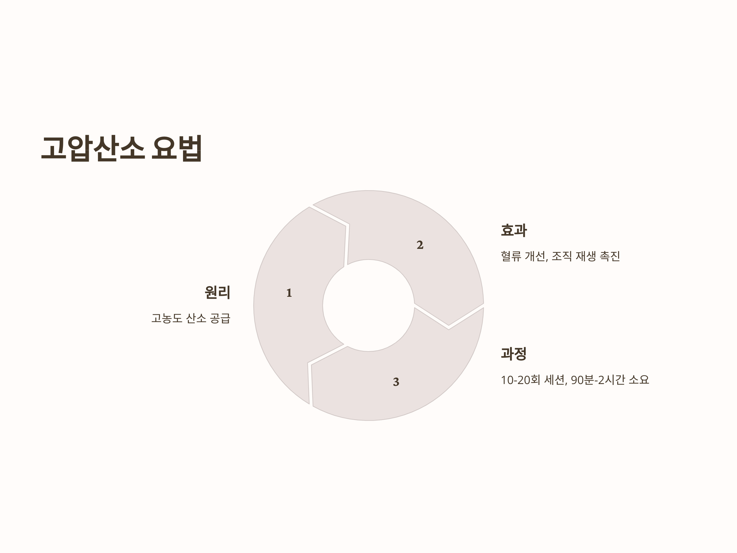 고압산소 요법의 장점은 약물에 의존하지 않고, 체내 자연적인 회복력을 촉진할 수 있다는 점입니다. 또한, 스테로이드 주사로 인한 부작용을 줄이면서 치료할 수 있다는 장점이 있습니다.