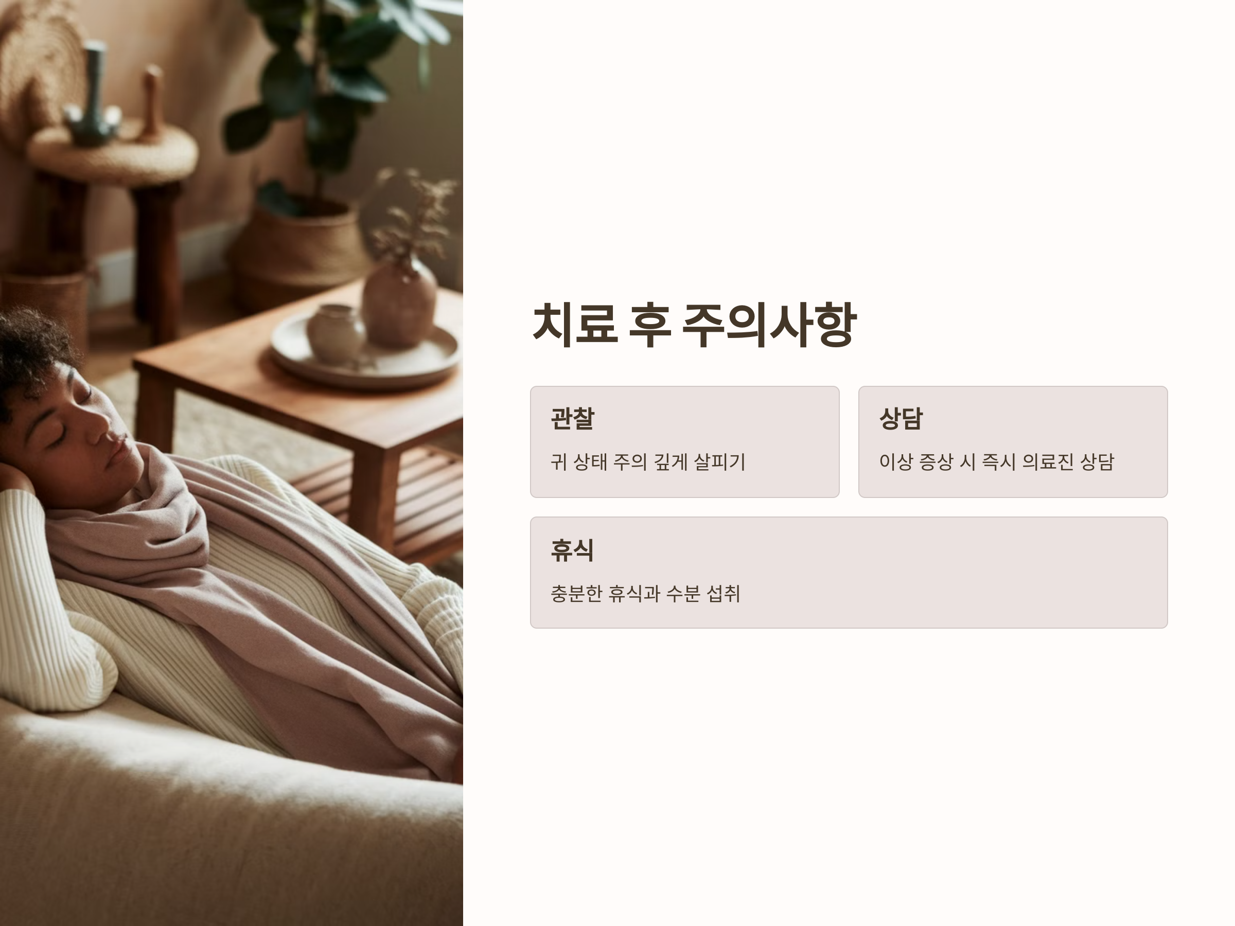 치료 후에는 일정 기간 동안 귀의 상태를 주의 깊게 살펴봐야 하며, 갑작스러운 소리의 변화나 귀의 통증이 발생하면 즉시 의료진과 상담하는 것이 중요합니다. 또한, 고압산소 요법을 받은 후에는 피로감이 나타날 수 있으며, 이를 완화하기 위해 충분한 휴식과 수분 섭취가 필요합니다.