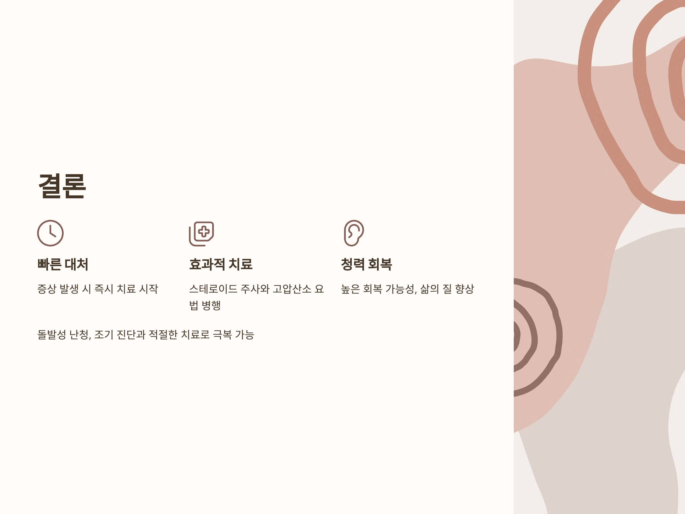 따라서 돌발성 난청이 의심될 경우, 즉시 전문 의료기관을 찾아 스테로이드 주사와 고압산소 요법 등을 통해 빠르게 치료를 시작하는 것이 중요합니다.