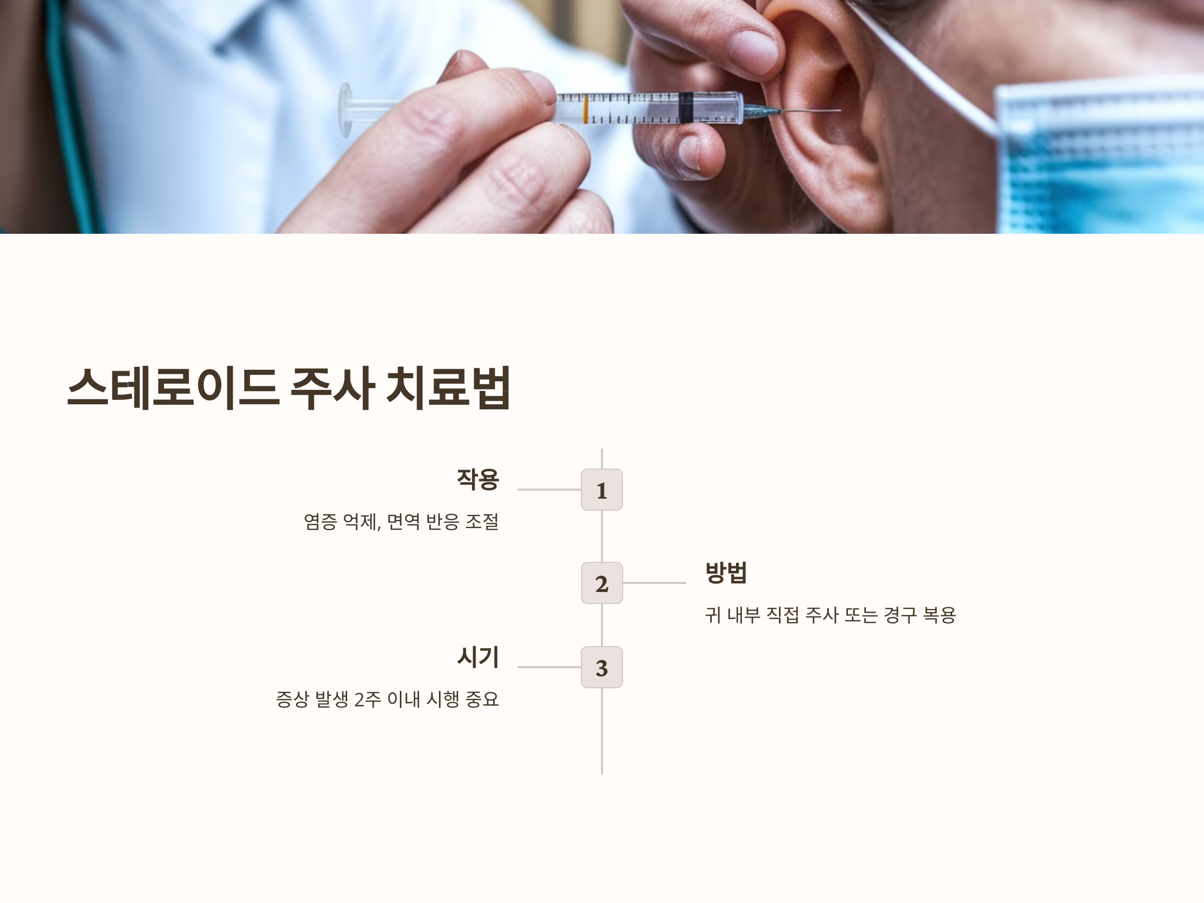 스테로이드 주사는 직접 귀 안으로 주사되기도 하며, 경구용 스테로이드 치료로 대체되기도 합니다. 그러나 귀에 직접 주입하는 방법이 효과적인 것으로 알려져 있습니다. 이는 스테로이드가 직접적으로 손상된 부위에 작용하여 염증을 빠르게 완화시키고, 청력을 회복시키기 때문입니다.