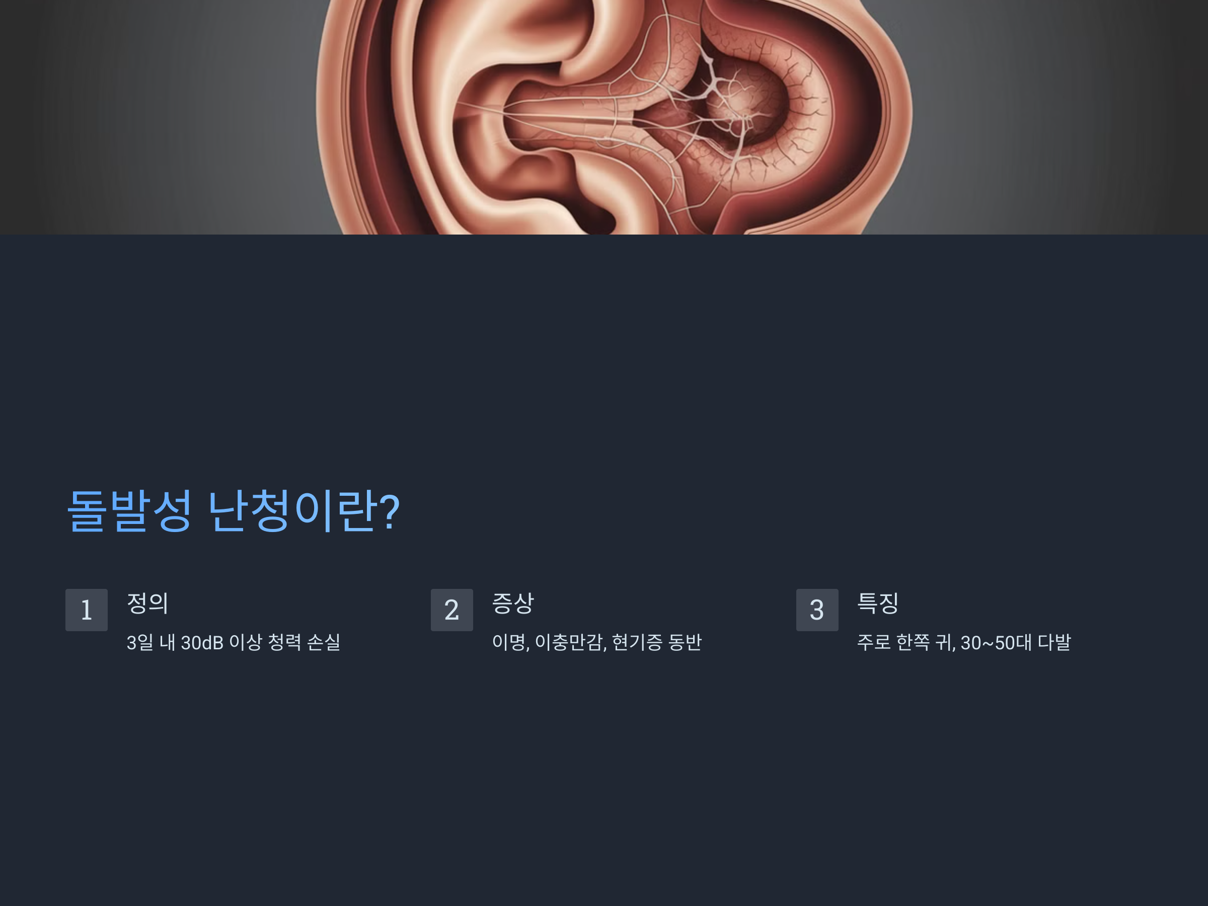 돌발성 난청은 3일 이내에 3개 이상의 연속된 주파수에서 30dB 이상의 청력 손실이 발생하는 감각신경성 난청을 의미합니다. 이명(귀에서 소리가 나는 현상), 이충만감(귀가 꽉 찬 느낌), 현기증 등을 동반할 수 있으며, 주로 한쪽 귀에 발생하고 30~50대에서 많이 나타납니다. citeturn0search1