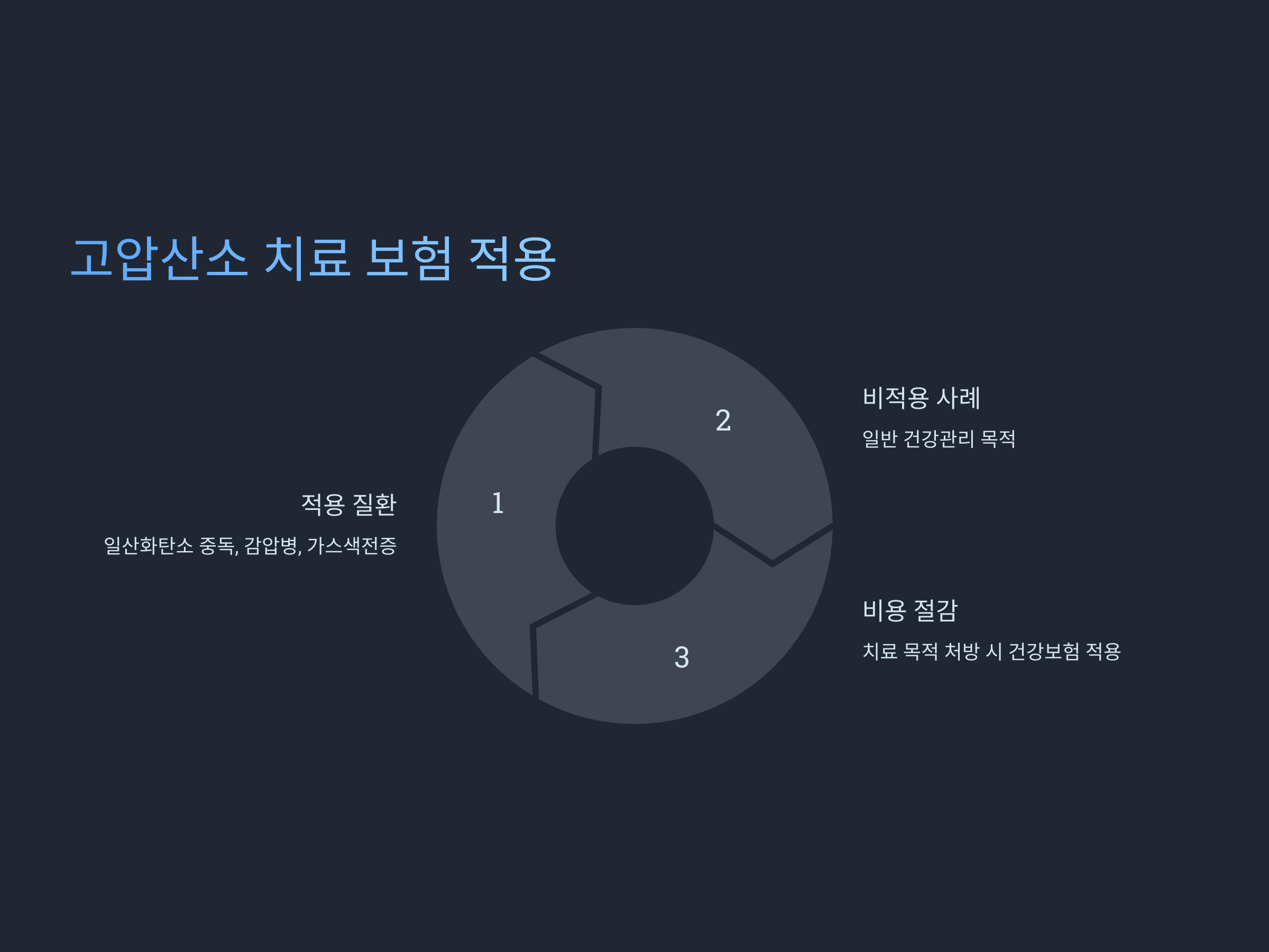 고압산소 치료는 치료 목적과 질환에 따라 건강보험 적용 여부가 다릅니다. 일반적인 건강관리 목적의 고압산소 치료는 건강보험 적용이 되지 않지만, 특정 질환 치료 목적이라면 건강보험 적용이 가능합니다. citeturn0search3