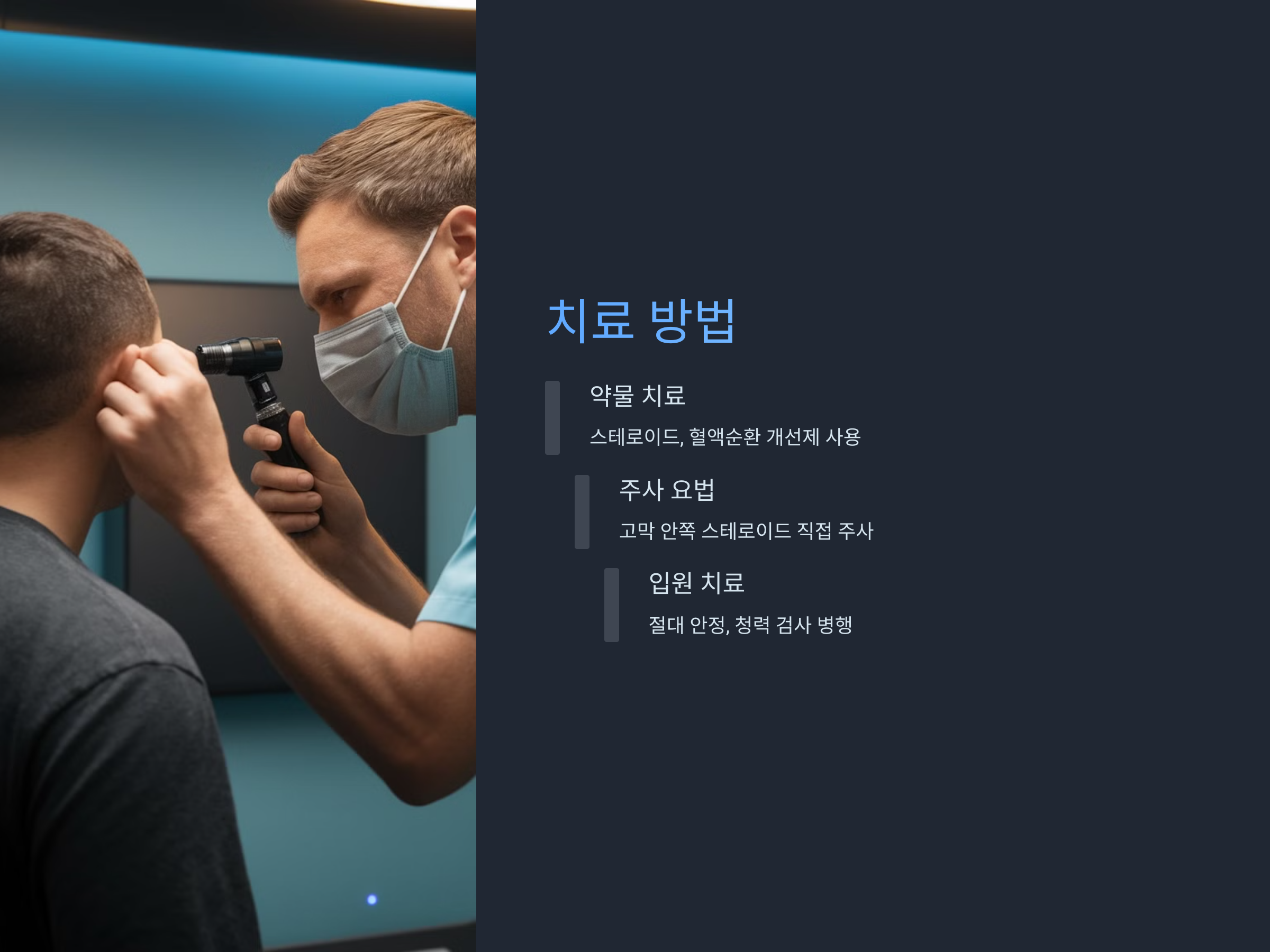 치료는 주로 스테로이드와 같은 항염증제를 사용하며, 혈액순환 개선제, 항바이러스제 등이 사용되기도 합니다. 경우에 따라 고막 안쪽에 스테로이드를 직접 주사하거나 수술적 요법을 시행하기도 합니다. 이러한 치료는 입원하여 절대 안정을 취하는 것이 원칙이며, 치료 경과를 관찰하기 위해 청력 검사를 병행합니다. citeturn0search1