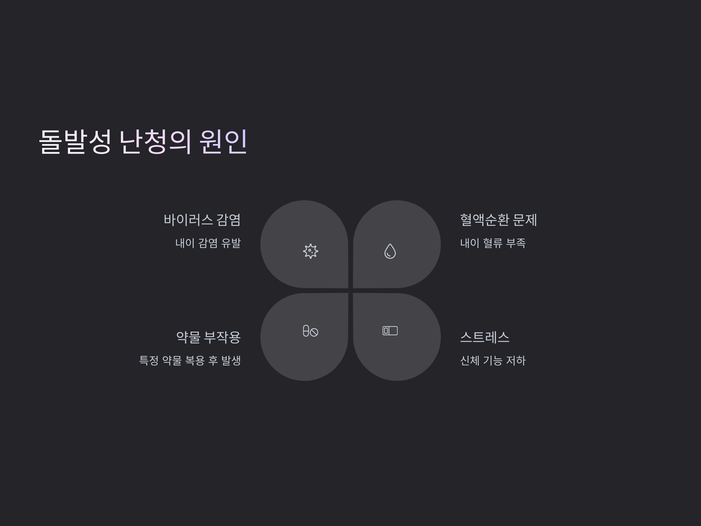 돌발성 난청은 여러 가지 원인에 의해 발생할 수 있습니다. 일부는 특정한 원인을 찾을 수 있지만, 많은 경우 원인이 불명확할 수 있습니다. 주요 원인으로는 바이러스 감염, 혈액순환 문제, 스트레스, 내이의 기능 저하 등이 있습니다. 특히, 내이의 혈류가 부족해지면 청력에 영향을 미칠 수 있으며, 이로 인해 갑작스럽게 청력 손실이 발생할 수 있습니다.
