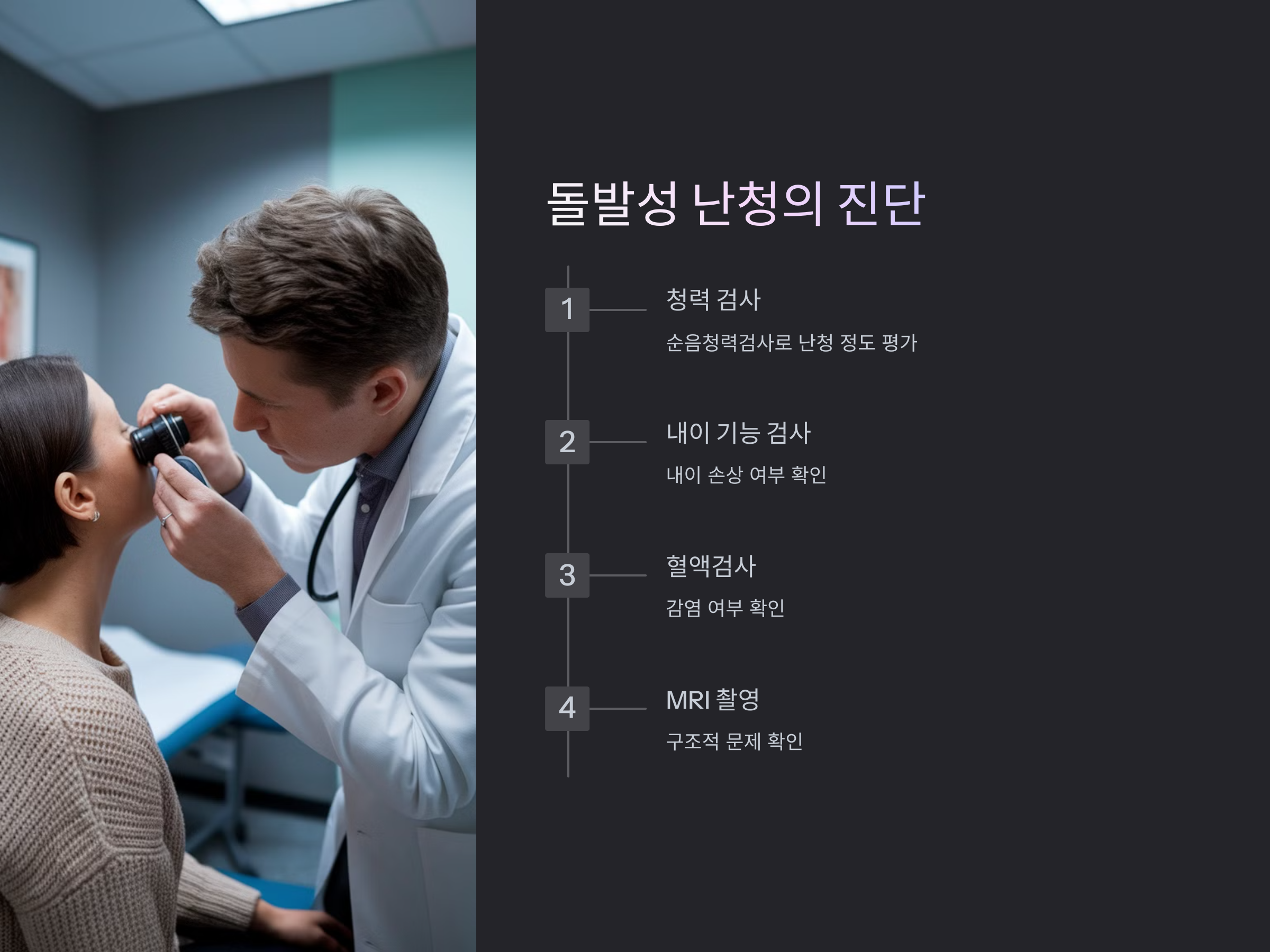때때로 돌발성 난청의 원인을 찾기 위해 혈액검사나 MRI 촬영이 필요할 수 있습니다. 특히 바이러스 감염이나 혈액순환 문제로 인한 난청일 경우 이를 확인하기 위한 추가적인 검사가 이루어집니다. 정확한 진단을 통해 원인을 알 수 있다면, 보다 효과적인 치료가 가능해집니다.