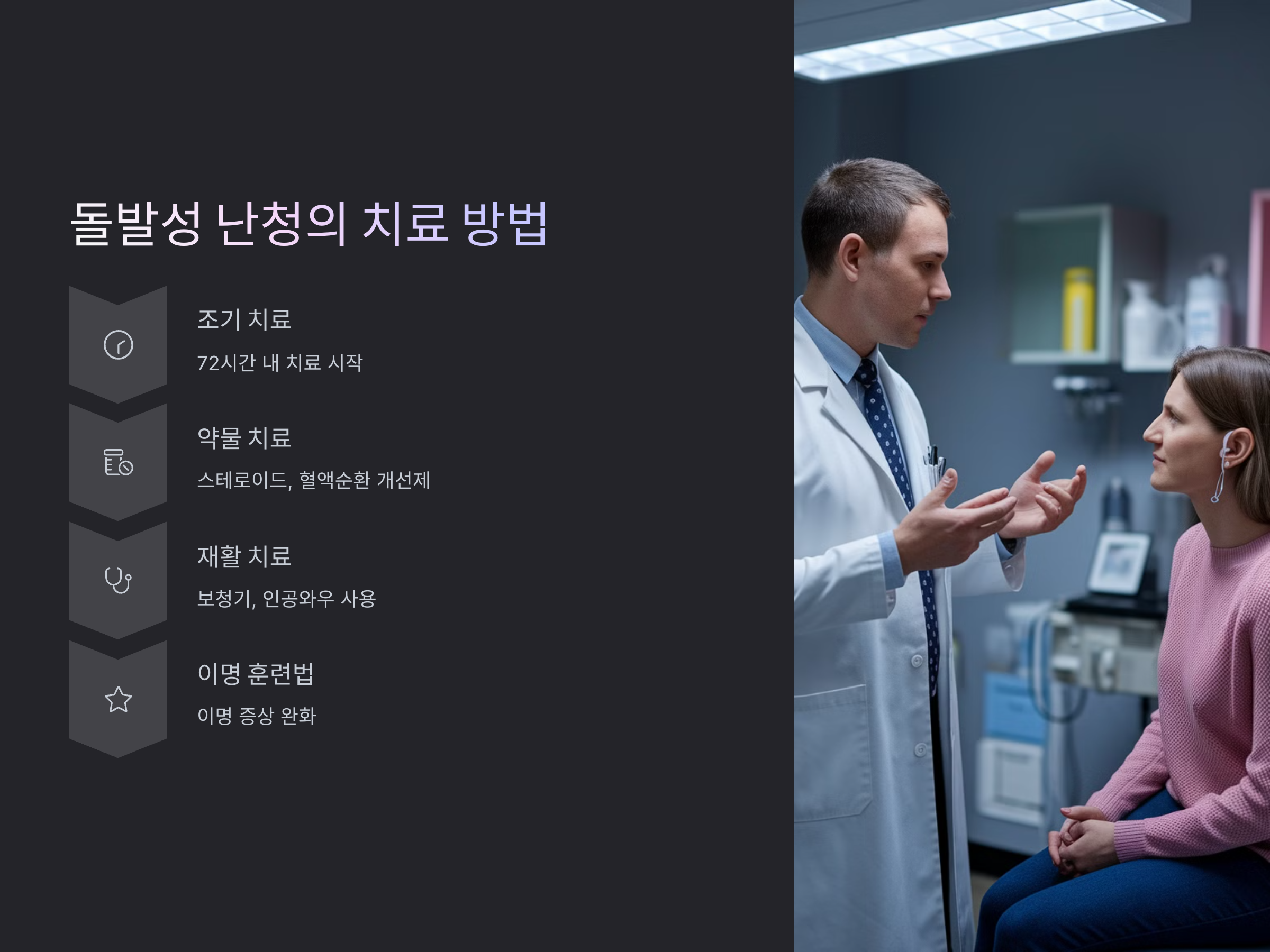 치료 방법으로는 약물 치료와 재활 치료가 주로 사용됩니다. 스테로이드 제제가 청력 회복에 효과적일 수 있으며, 혈액순환 개선을 위한 약물이나 바이러스 감염에 의한 경우 항바이러스제를 사용하기도 합니다. 또한, 이명이 동반된 경우, 이명 치료를 위한 특수한 치료가 필요할 수 있습니다.