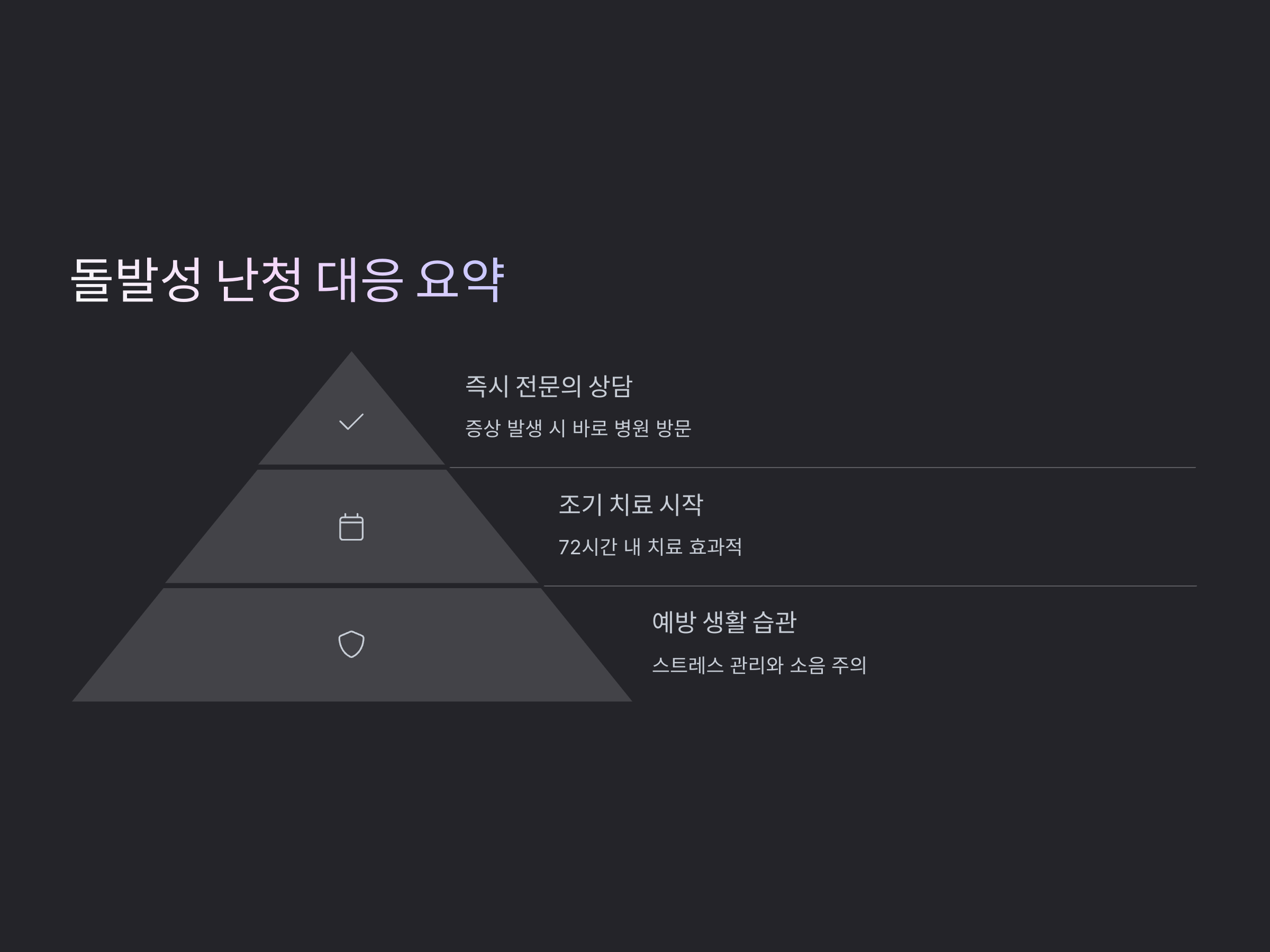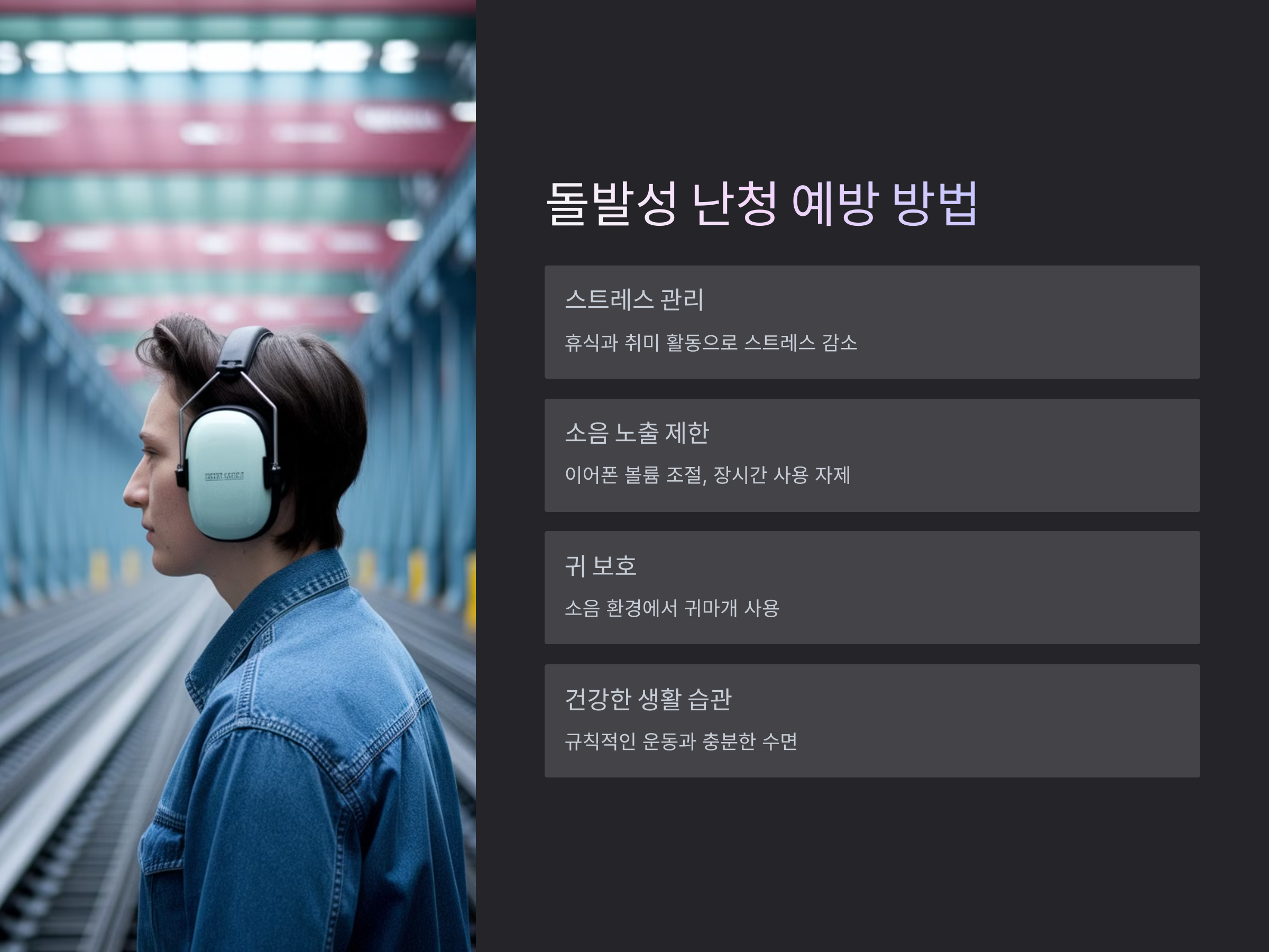 이와 같은 증상이 나타난다면, 즉시 전문의의 상담을 받고 적절한 조치를 취하는 것이 필요합니다. 돌발성 난청은 심각한 청력 손실로 이어질 수 있기 때문에 조기에 치료받는 것이 중요합니다. 예방을 위해 스트레스 관리와 소음에 대한 주의가 필요하며, 건강한 생활 습관을 유지하는 것이 가장 좋은 예방책입니다.
