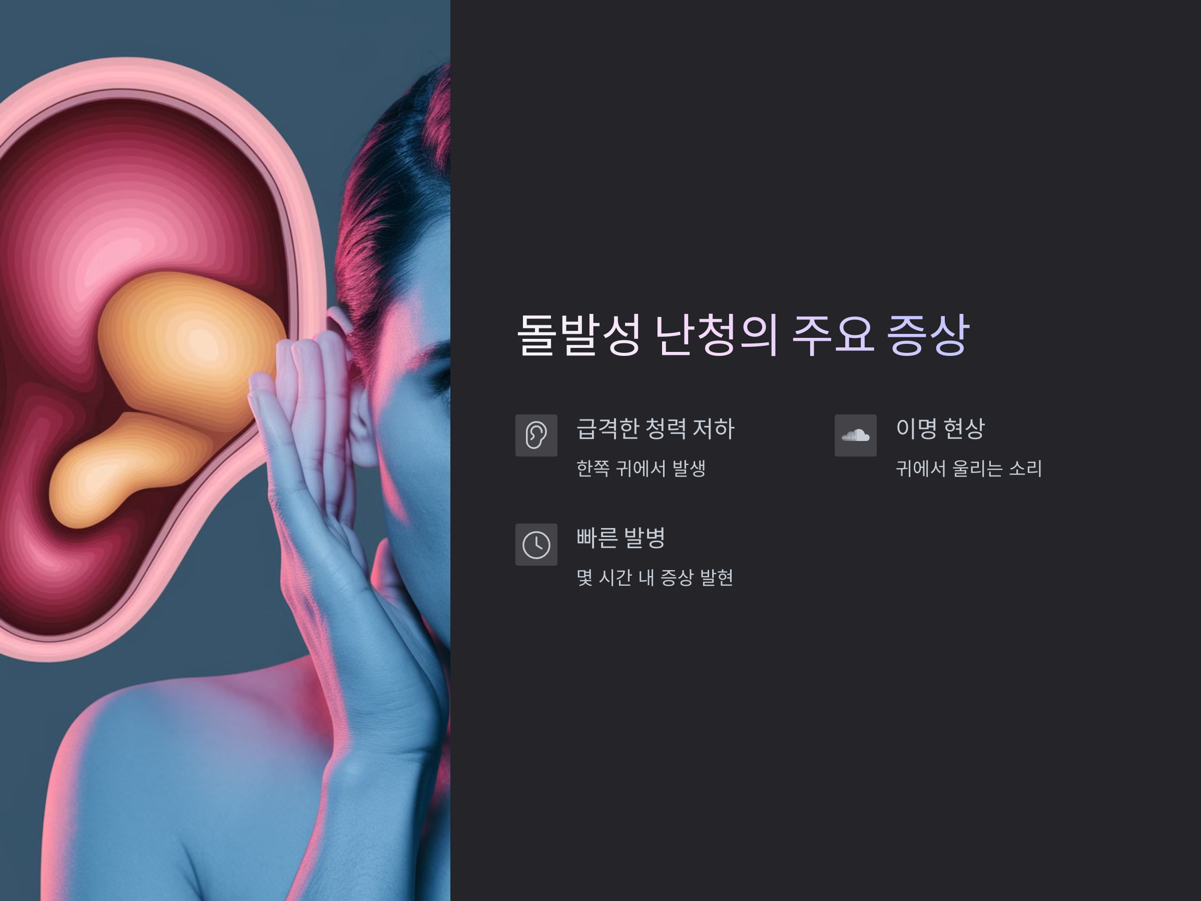 돌발성 난청의 주요 증상은 한쪽 귀에서 발생하는 급격한 청력 저하입니다. 이 상태는 일반적으로 통증을 동반하지 않지만, 일부 환자에서는 귀에서 소리가 나는 '이명' 현상도 함께 나타날 수 있습니다. 돌발성 난청은 그 원인이 다양할 수 있기 때문에 정확한 진단과 치료가 중요합니다.