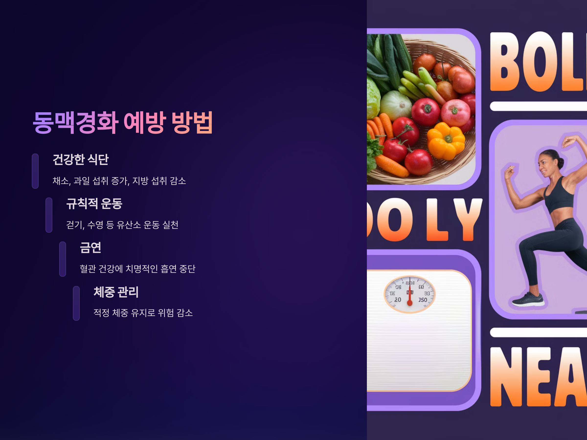 - 체중 관리: 과체중일 경우 동맥경화 위험이 높아지므로 적정 체중을 유지하세요.
