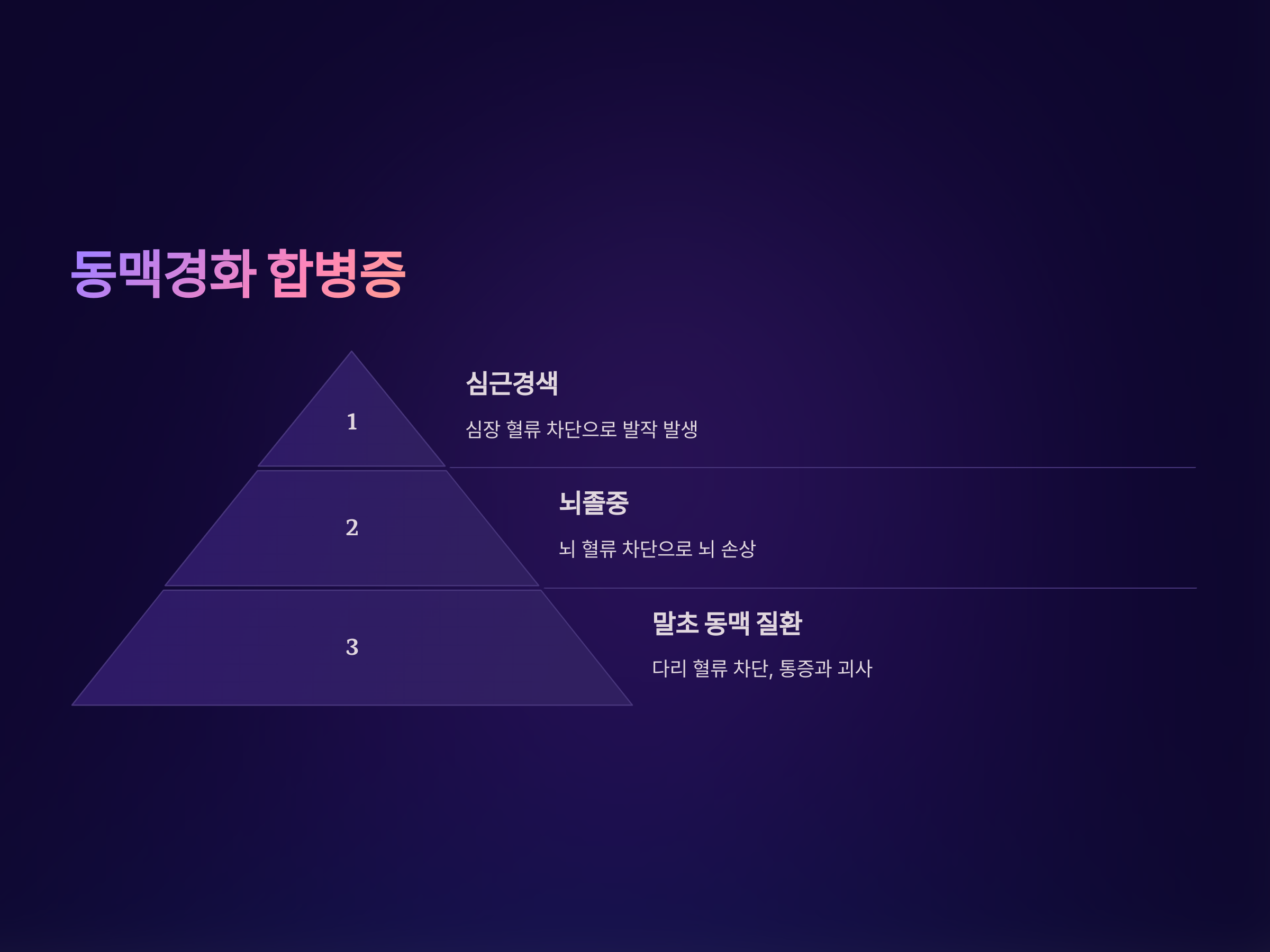 동맥경화는 초기에는 뚜렷한 증상이 없지만, 진행되면 심근경색, 뇌졸중, 말초 혈관 질환과 같은 합병증으로 이어질 수 있습니다.
