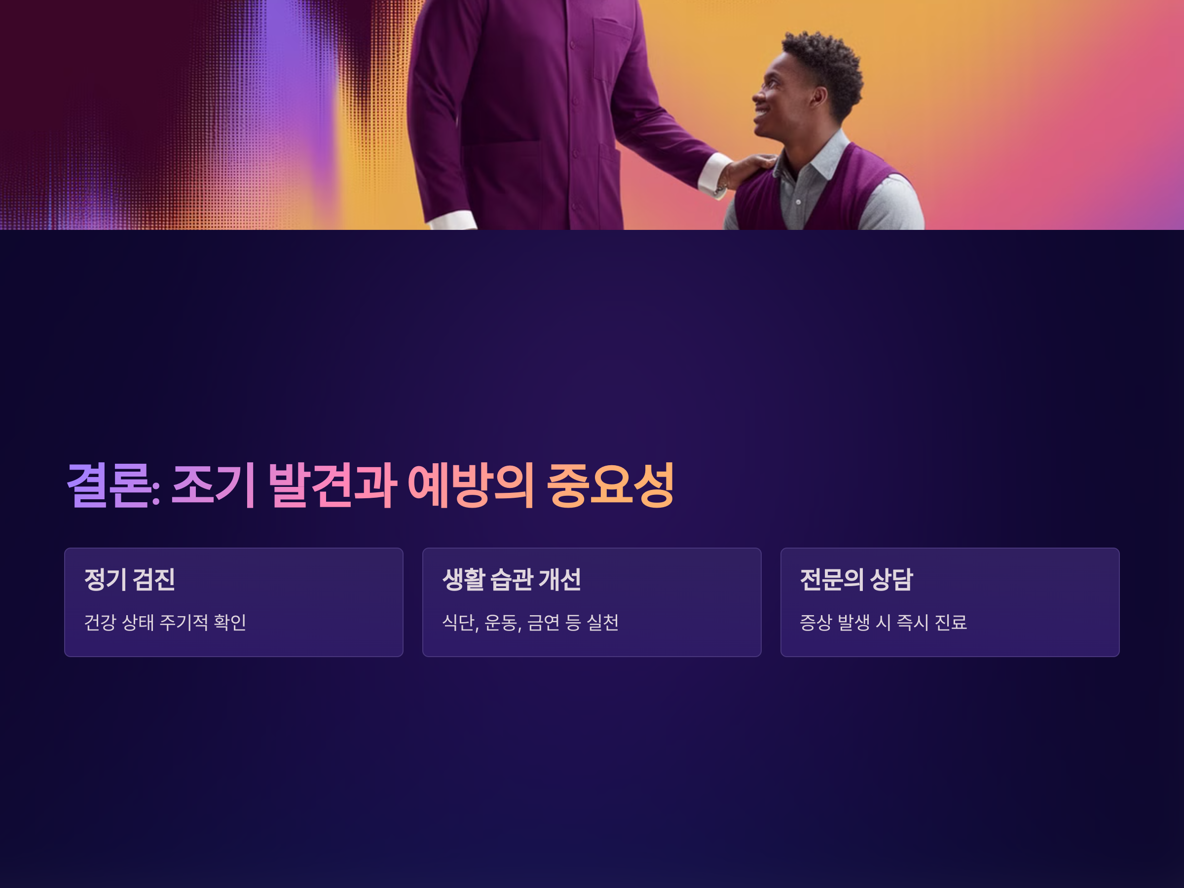 동맥경화는 조기 발견과 예방이 무엇보다 중요합니다. 건강한 생활 습관을 실천하고 정기적으로 건강 검진을 받는 것이 중요합니다.