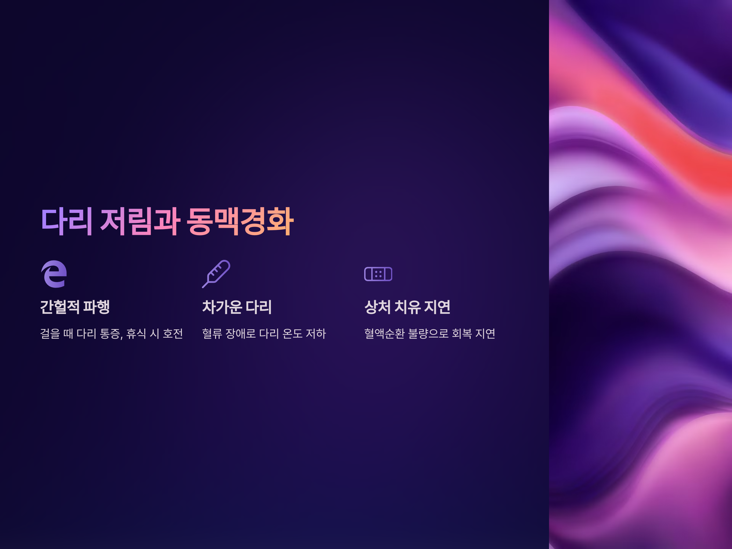 - 차가운 다리: 혈류 장애로 인해 다리가 차가워지는 증상이 나타납니다.