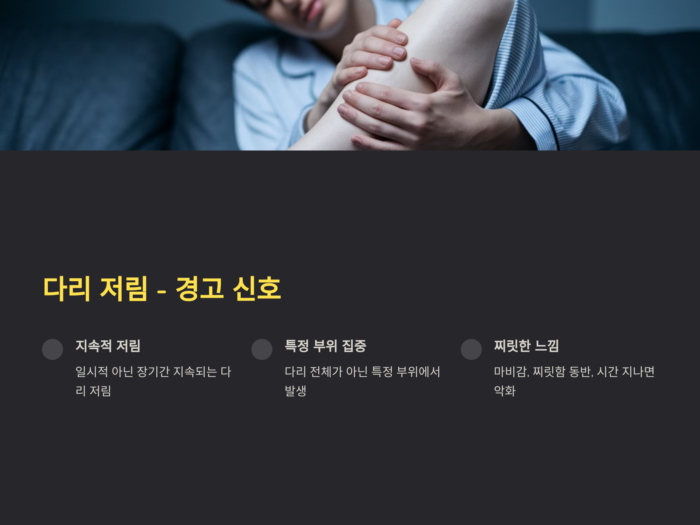 다리 저림은 일반적으로 일시적인 증상으로 생각할 수 있지만, 동맥경화증의 경우 장기간 지속되거나 반복될 수 있습니다. 이때, 저림은 다리 전체가 아닌 특정 부위에서 발생하며, 다리가 찌릿하거나 마비된 느낌을 주기도 합니다. 혈액순환이 원활하지 않기 때문에 다리의 신경이 자극을 받으면서 발생하는 증상으로, 시간이 지나면 점차 심해질 수 있습니다.