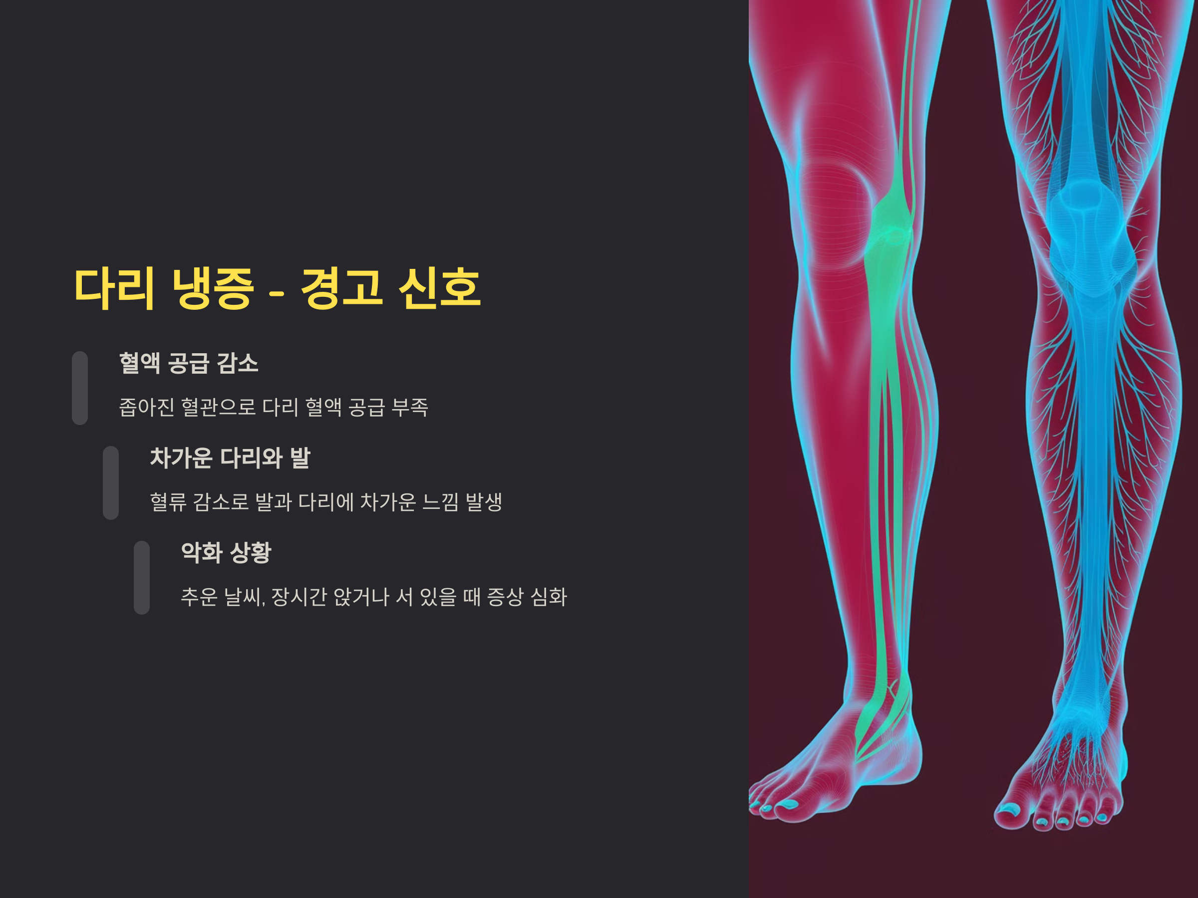 냉증은 다리나 발이 차가워지는 증상으로, 혈액이 충분히 공급되지 않아 발생합니다. 특히 동맥경화증이 있는 사람은 혈관이 좁아지면서 혈액이 잘 흐르지 않게 되어, 다리가 차가운 느낌을 받을 수 있습니다. 추운 날씨에 더욱 악화될 수 있으며, 장시간 앉아있거나 서 있을 때도 증상이 심해질 수 있습니다.